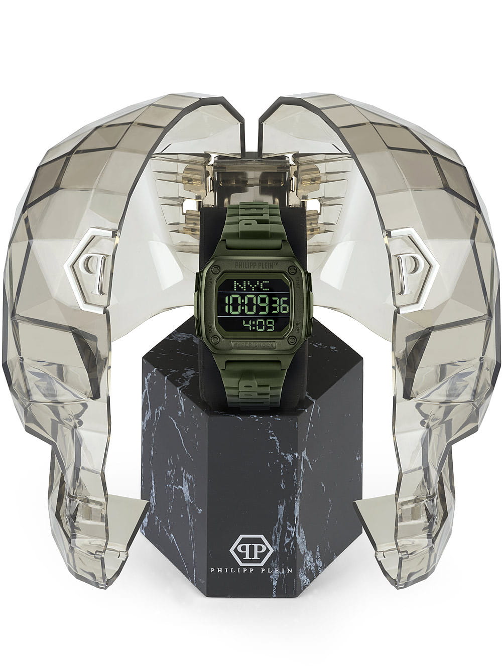 Электронные унисекс часы-хронографХронографФункция позволяет измерять отрезки времени с особой точностью: часы, минуты, секунды. Верным признаком хронографа является наличие на циферблате 3 дополнительных окошек-счётчиков. Philipp Plein Hyper Shock PWHAA0421, электронный механизм с высокой точностью. Класс водозащиты: 50 метров, позволит защитить корпус от случайных брызг или капель дождя. Прямоугольный корпус выполнен из нержавеющей стали с IP-покрытиемIP-покрытиеМетод ионного напыления. Демонстрирует повышенную устойчивость к истиранию, окислению и химическим веществам. Под воздействием высокого давления и температуры около 1500°C молекулы металла надёжно соединяются с частицами корпуса часов. зеленого цвета. Силиконовый ремешок шириной 22 мм, со стандартной застежкой.