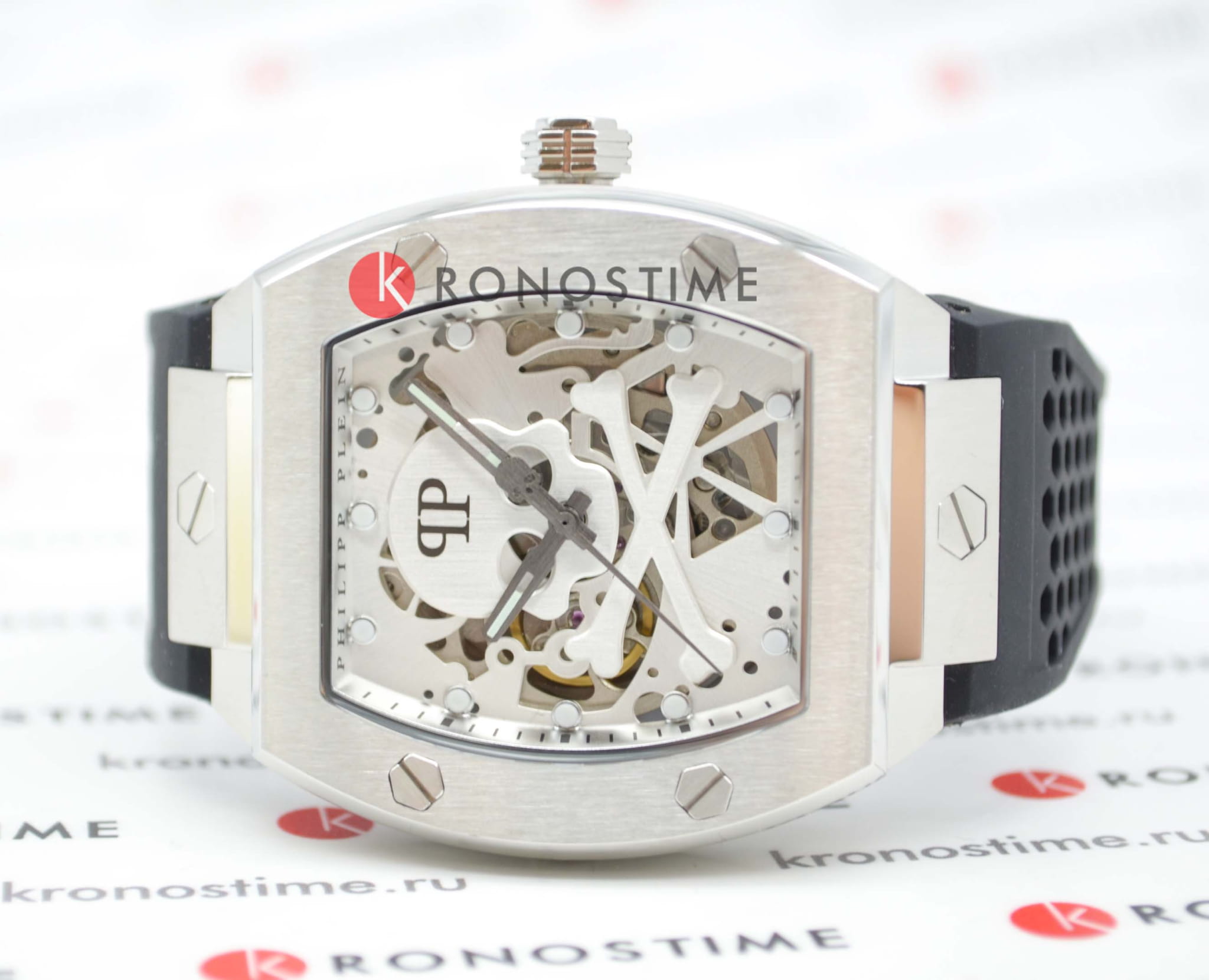 Мужские механические часы-скелетоны Philipp Plein The Skeleton PWBAA2123. Корпус часов изготовлен из нержавеющей стали. Минеральное стеклоМинеральное стеклоМинеральное стекло представляет собой искусственно выращенный минерал кварца. Такое стекло отличается особой устойчивостью к повреждениям и царапинам. Уступает по некоторым качествам сапфировому стеклу. устойчивое к мелким механическим повреждениям. Влагозащита: 50 метров, позволит защитить корпус от случайных брызг или капель дождя. Стрелки с люминесцентным покрытиемЛюминесцентное покрытиеПозволяет считывать показания времени в темноте. Производители наносят на стрелки, часовые индексы, безель или поверхность циферблата светонакопительный состав, дающий холодное свечение.. Практичный ремешок из силикона на стандартной застёжке.