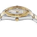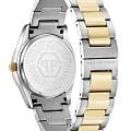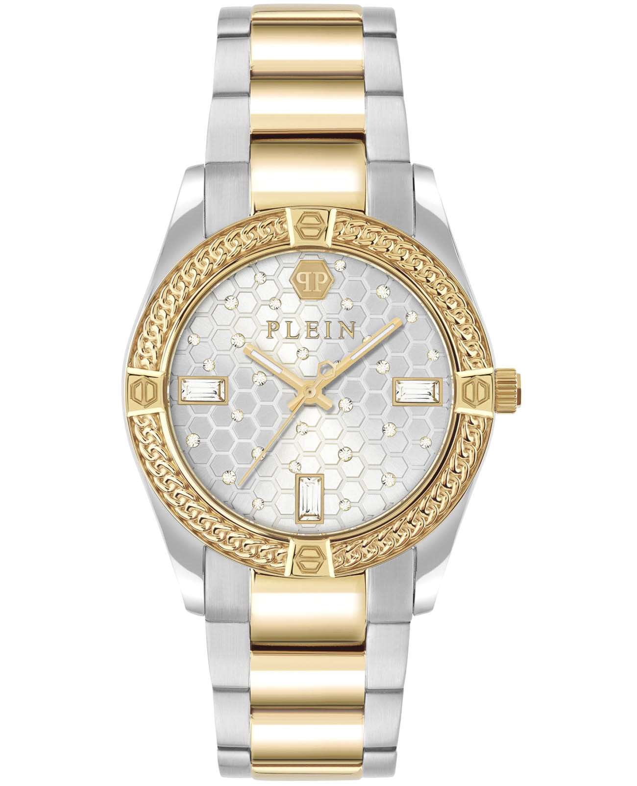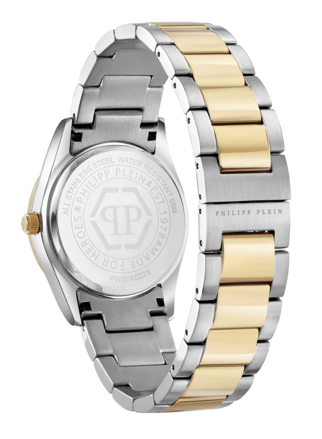 Женские кварцевые часы Philipp Plein Plein Icon Chain PW1FA0225 — это стильное сочетание элегантности и современного дизайна. Изящный корпус выполнен из нержавеющей стали, диаметром 36 мм, что придаст образу женственности и романтизма. Изысканный циферблат с метками в виде штрихов придает модели особый блеск. Циферблат защищен минеральным стекломМинеральное стеклоМинеральное стекло представляет собой искусственно выращенный минерал кварца. Такое стекло отличается особой устойчивостью к повреждениям и царапинам. Уступает по некоторым качествам сапфировому стеклу., обеспечивающий устойчивость к царапинам и украшен кристаллами. Стрелки с люминесцентным покрытиемЛюминесцентное покрытиеПозволяет считывать показания времени в темноте. Производители наносят на стрелки, часовые индексы, безель или поверхность циферблата светонакопительный состав, дающий холодное свечение.. БезельБезельВнешний ободок, закрепляющий стекло. В спортивных часах так называется поворотное кольцо с делениями на циферблате, выполняет роль таймера – замеряет отрезки времени на шкале. Неподвижный безель – элемент декора. Однонаправленно вращающийся безель на дайверских часах позволяет фиксировать моменты погружения и выныривания на поверхность. с PVD-покрытиемPVDУльтратонкое покрытие наносится в технике вакуумного напыления, сочетает в себе нитрид титана особой прочности со слоем золота или оксида хрома. Несёт в себе декоративную или защитную функцию. золотистого цвета. Часы оснащены надежным кварцевым механизмом. Стальной браслет с частичным PVD-покрытиемPVDУльтратонкое покрытие наносится в технике вакуумного напыления, сочетает в себе нитрид титана особой прочности со слоем золота или оксида хрома. Несёт в себе декоративную или защитную функцию. на застёжке-бабочкеЗастёжка "бабочка"Такой вид застёжки дополняется предохранителями, помогающими избежать случайного раскрытия браслета. Обладают изящным исполнением. , гарантирует комфортное и безопасное ношение. Класс водозащиты: 50 метров позволит защитить корпус от случайных брызг или капель дождя. Phlipp Plein — отличный выбор для тех, кто ценит яркость и качество.
