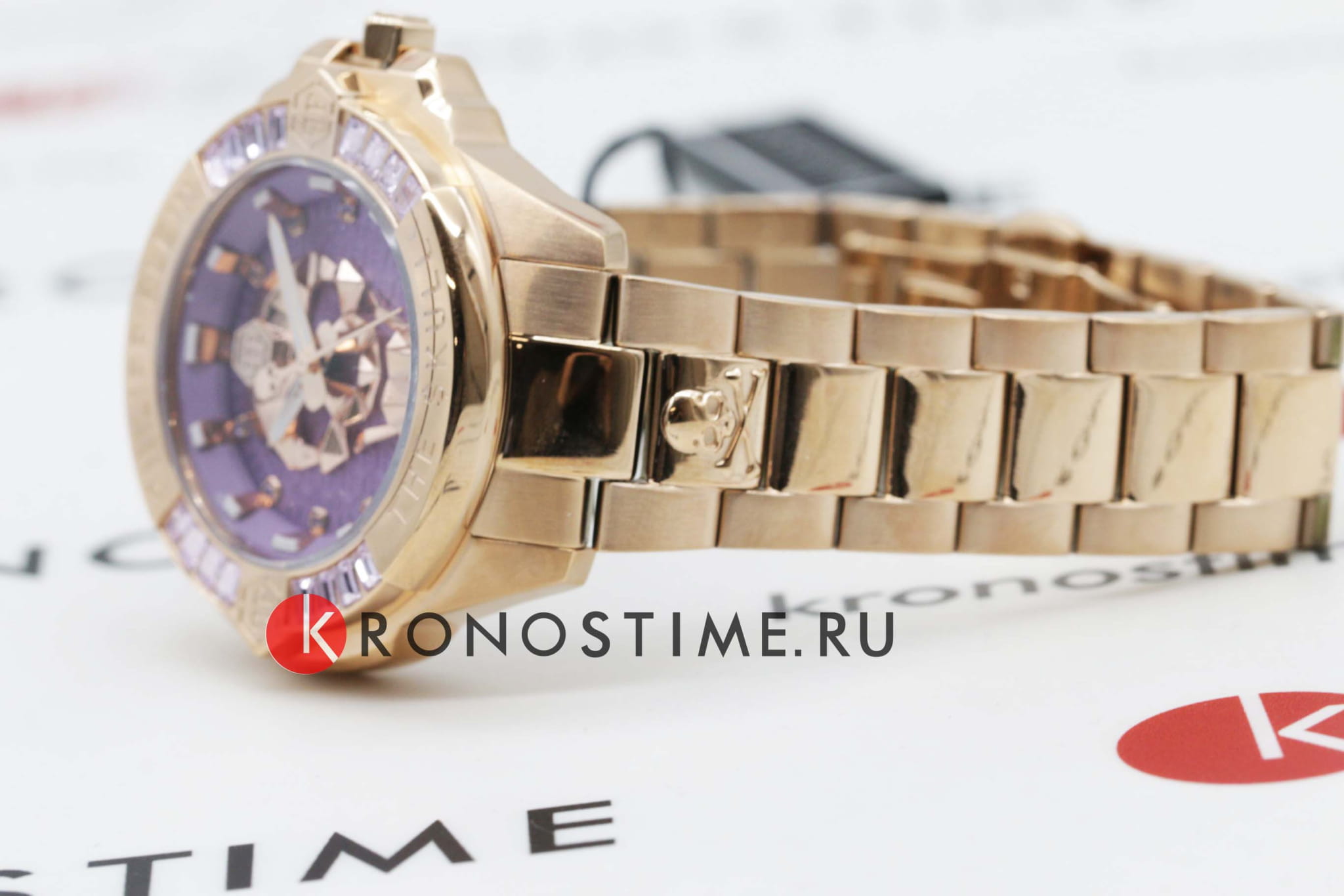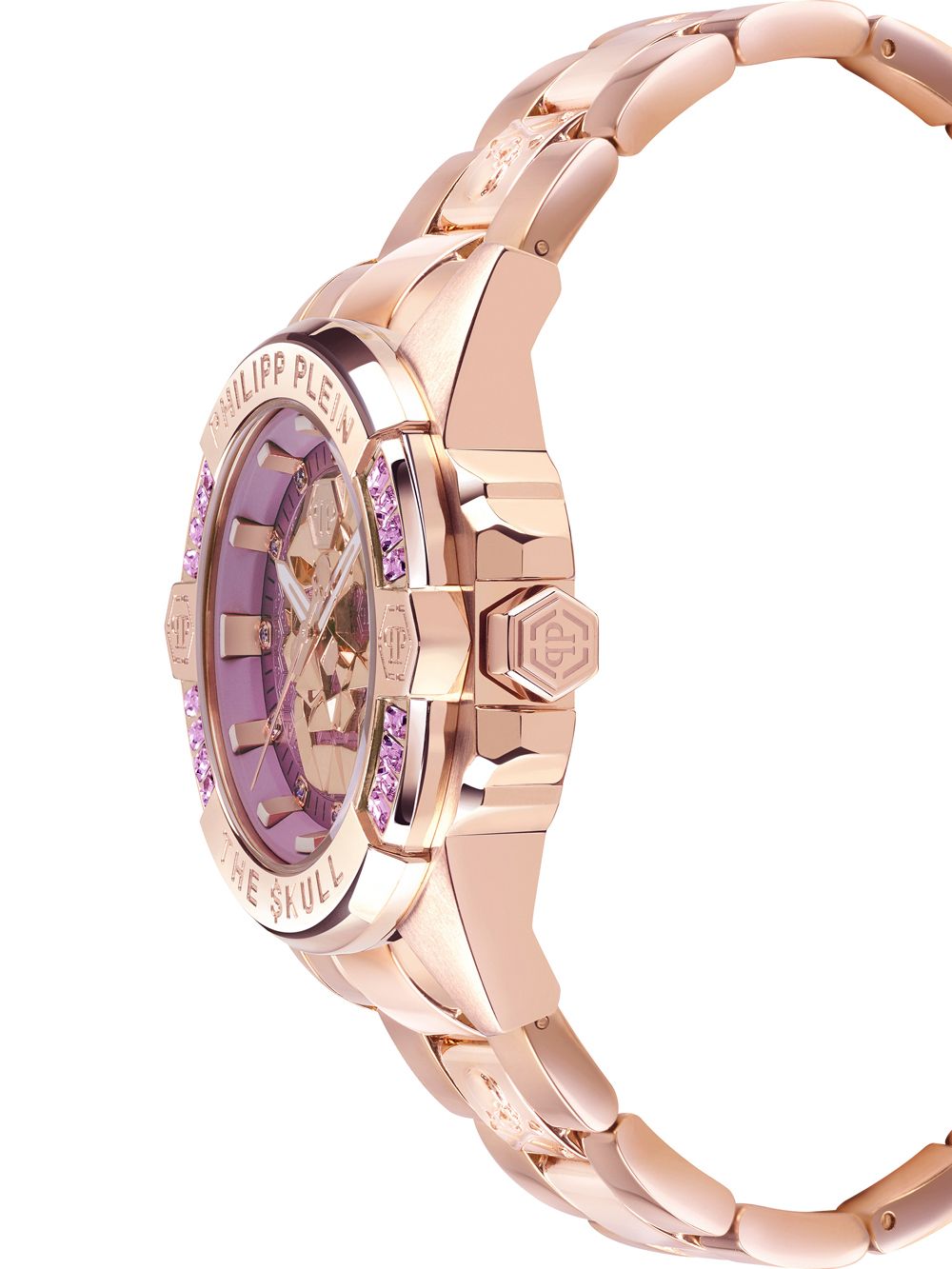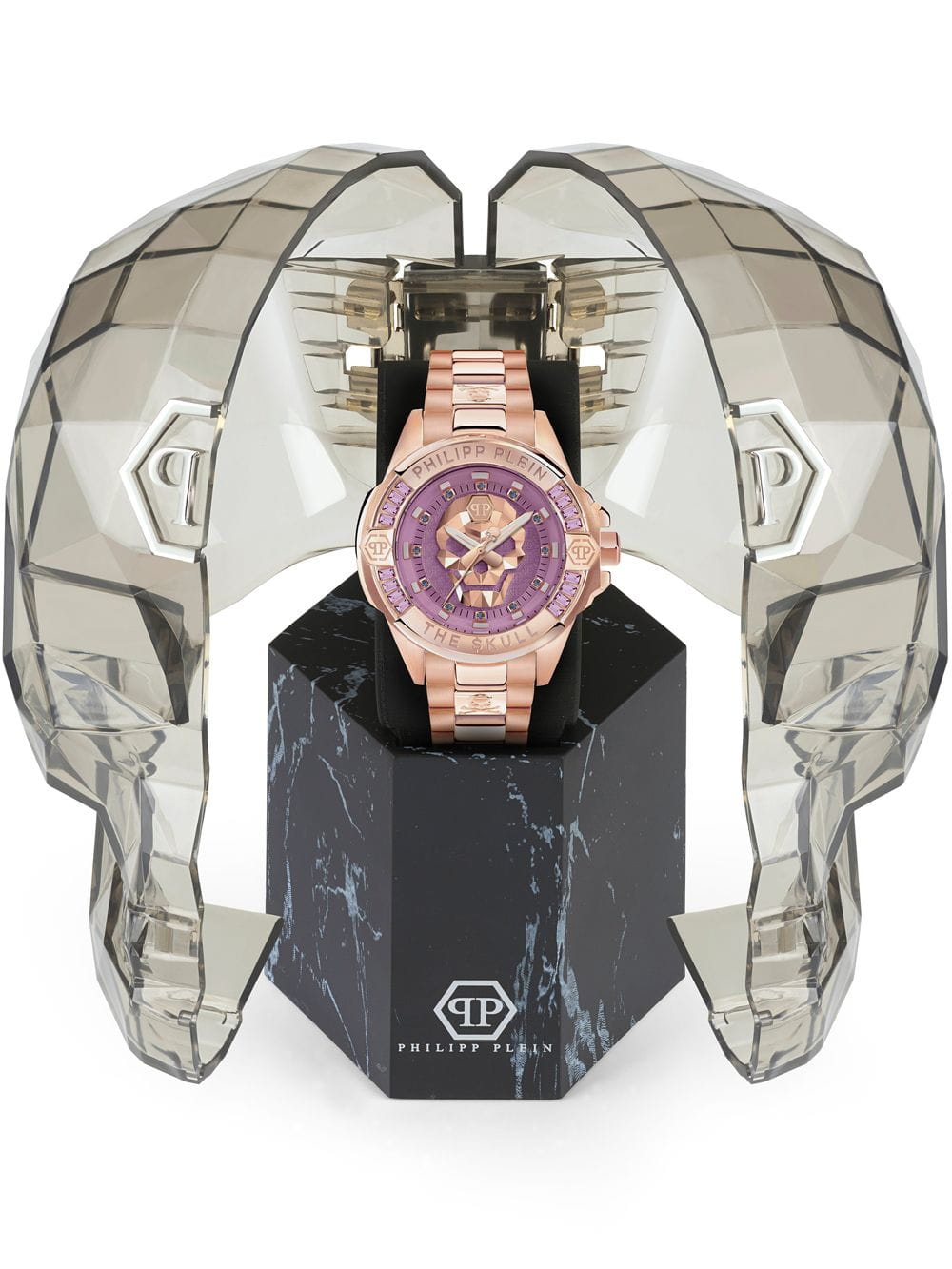 Яркие унисекс часы с минеральным стекломМинеральное стеклоМинеральное стекло представляет собой искусственно выращенный минерал кварца. Такое стекло отличается особой устойчивостью к повреждениям и царапинам. Уступает по некоторым качествам сапфировому стеклу. Philipp Plein The Skull PWNAA0822, кварцевый механизм с высокой точностью. Класс водозащиты: 50 метров, позволит защитить корпус от случайных брызг или капель дождя. Корпус часов изготовлен из стали с IP-покрытиемIP-покрытиеМетод ионного напыления. Демонстрирует повышенную устойчивость к истиранию, окислению и химическим веществам. Под воздействием высокого давления и температуры около 1500°C молекулы металла надёжно соединяются с частицами корпуса часов.. Круглый стальной корпус украшен кристаллами Swarovski. Циферблат с метками в виде точек украшенных кристаллами Swarovski, дополнен трехмерным граненым черепом. Шестигранная заводная головка с защитой. Застёжка бабочка с кнопкамиЗастёжка "бабочка"Такой вид застёжки дополняется предохранителями, помогающими избежать случайного раскрытия браслета. Обладают изящным исполнением. .