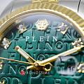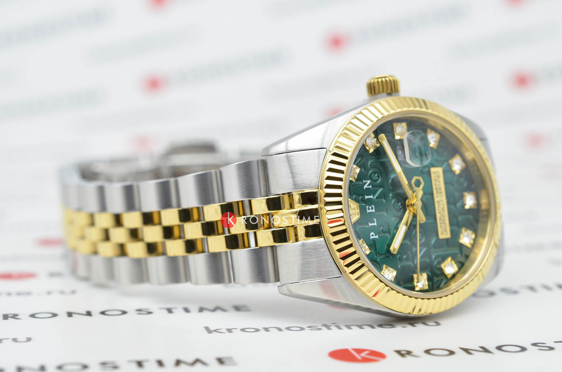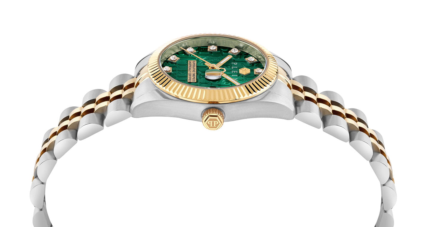 Philipp Plein DATE SUPERLATIVE PWNFA0325 - дерзкое заявление любви к роскоши и бунтарскому стилю. Диаметр круглого корпуса из прочной нержавеющей стали равен 28 мм. Стальной браслет на застёжке «бабочка» с кнопкамиЗастёжка "бабочка"Такой вид застёжки дополняется предохранителями, помогающими избежать случайного раскрытия браслета. Обладают изящным исполнением. обеспечивает надёжную фиксацию и комфортное ношение. Метки в виде кристаллов Preciosa. Минеральное стеклоМинеральное стеклоМинеральное стекло представляет собой искусственно выращенный минерал кварца. Такое стекло отличается особой устойчивостью к повреждениям и царапинам. Уступает по некоторым качествам сапфировому стеклу. защищает циферблат от царапин. Люминесцентное покрытиеЛюминесцентное покрытиеПозволяет считывать показания времени в темноте. Производители наносят на стрелки, часовые индексы, безель или поверхность циферблата светонакопительный состав, дающий холодное свечение. стрелок и меток позволит следить за временем даже в полной темноте. БезельБезельВнешний ободок, закрепляющий стекло. В спортивных часах так называется поворотное кольцо с делениями на циферблате, выполняет роль таймера – замеряет отрезки времени на шкале. Неподвижный безель – элемент декора. Однонаправленно вращающийся безель на дайверских часах позволяет фиксировать моменты погружения и выныривания на поверхность. с PVD-покрытиемPVDУльтратонкое покрытие наносится в технике вакуумного напыления, сочетает в себе нитрид титана особой прочности со слоем золота или оксида хрома. Несёт в себе декоративную или защитную функцию.. Граненая заводная головка. Влагозащита: 50 метров, позволит защитить корпус от случайных брызг или капель дождя. Идеальный аксессуар для тех, кто ценит индивидуальность и не боится выделяться из толпы.