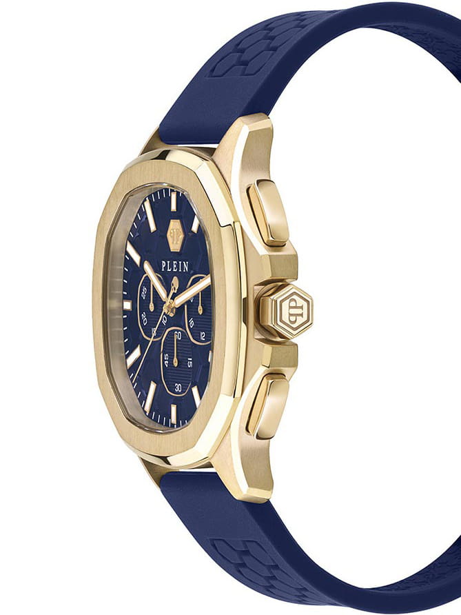 Яркие мужские часы-хронографХронографФункция позволяет измерять отрезки времени с особой точностью: часы, минуты, секунды. Верным признаком хронографа является наличие на циферблате 3 дополнительных окошек-счётчиков. с секундомеромСекундомерСекундоме́р — прибор, способный измерять интервалы времени с точностью до долей секунды. Philipp Plein PWSAA0323, кварцевый механизм с высокой точностью. Класс водозащиты: 50 метров, позволит защитить корпус от случайных брызг или капель дождя. Корпус часов изготовлен из стали с IP-покрытиемIP-покрытиеМетод ионного напыления. Демонстрирует повышенную устойчивость к истиранию, окислению и химическим веществам. Под воздействием высокого давления и температуры около 1500°C молекулы металла надёжно соединяются с частицами корпуса часов.. Стрелки и метки с люминесцентным покрытиемЛюминесцентное покрытиеПозволяет считывать показания времени в темноте. Производители наносят на стрелки, часовые индексы, безель или поверхность циферблата светонакопительный состав, дающий холодное свечение..