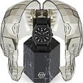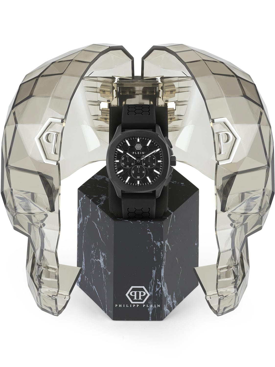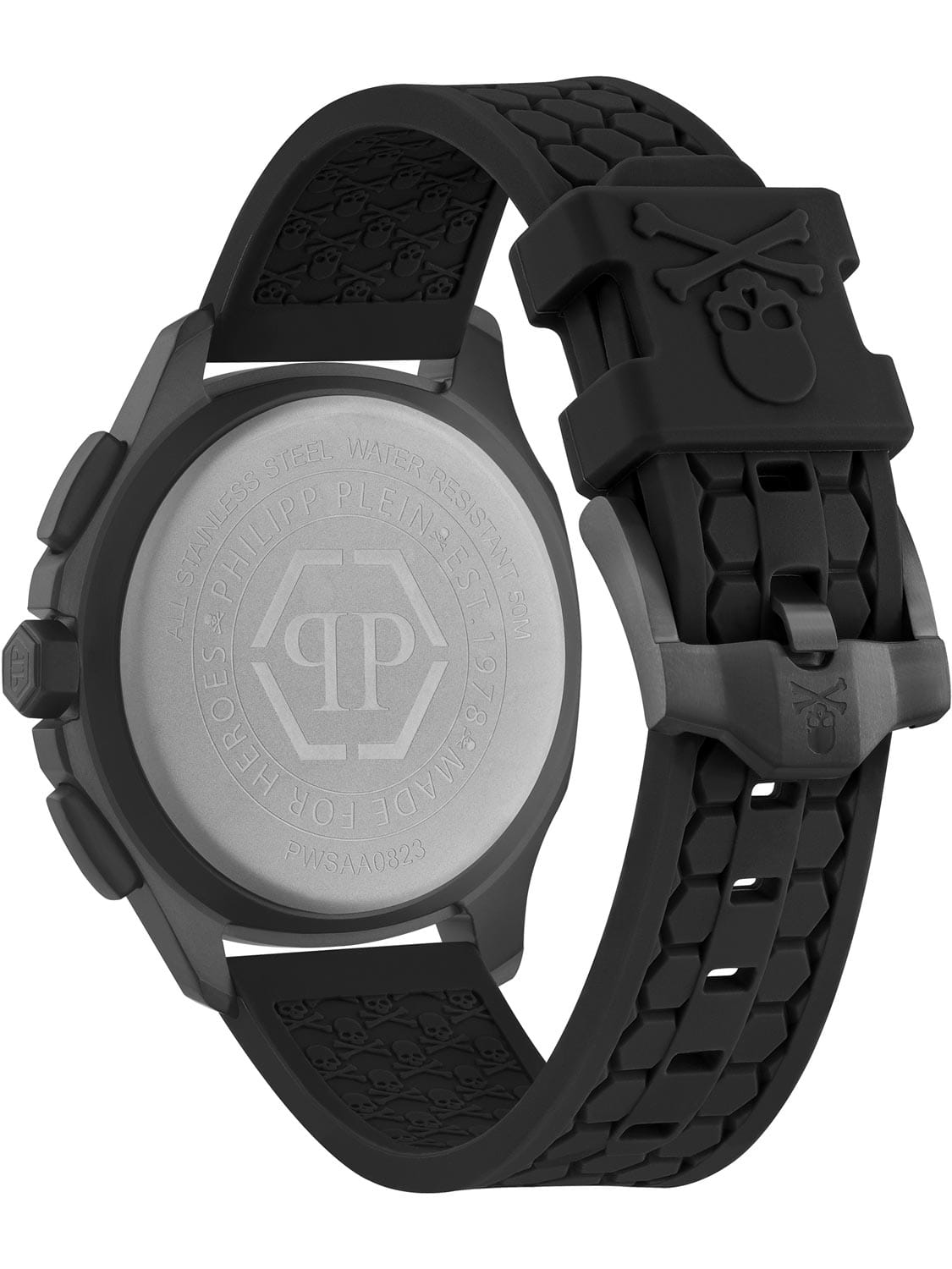 Яркие мужские часы-хронографХронографФункция позволяет измерять отрезки времени с особой точностью: часы, минуты, секунды. Верным признаком хронографа является наличие на циферблате 3 дополнительных окошек-счётчиков. с секундомеромСекундомерСекундоме́р — прибор, способный измерять интервалы времени с точностью до долей секунды.  Philipp Plein The Skull PWSAA0823, кварцевый механизм с высокой точностью. Класс водозащиты: 50 метров, позволит защитить корпус от случайных брызг или капель дождя. Корпус часов изготовлен из стали с IP-покрытиемIP-покрытиеМетод ионного напыления. Демонстрирует повышенную устойчивость к истиранию, окислению и химическим веществам. Под воздействием высокого давления и температуры около 1500°C молекулы металла надёжно соединяются с частицами корпуса часов.. Стрелки и метки с люминесцентным покрытиемЛюминесцентное покрытиеПозволяет считывать показания времени в темноте. Производители наносят на стрелки, часовые индексы, безель или поверхность циферблата светонакопительный состав, дающий холодное свечение..