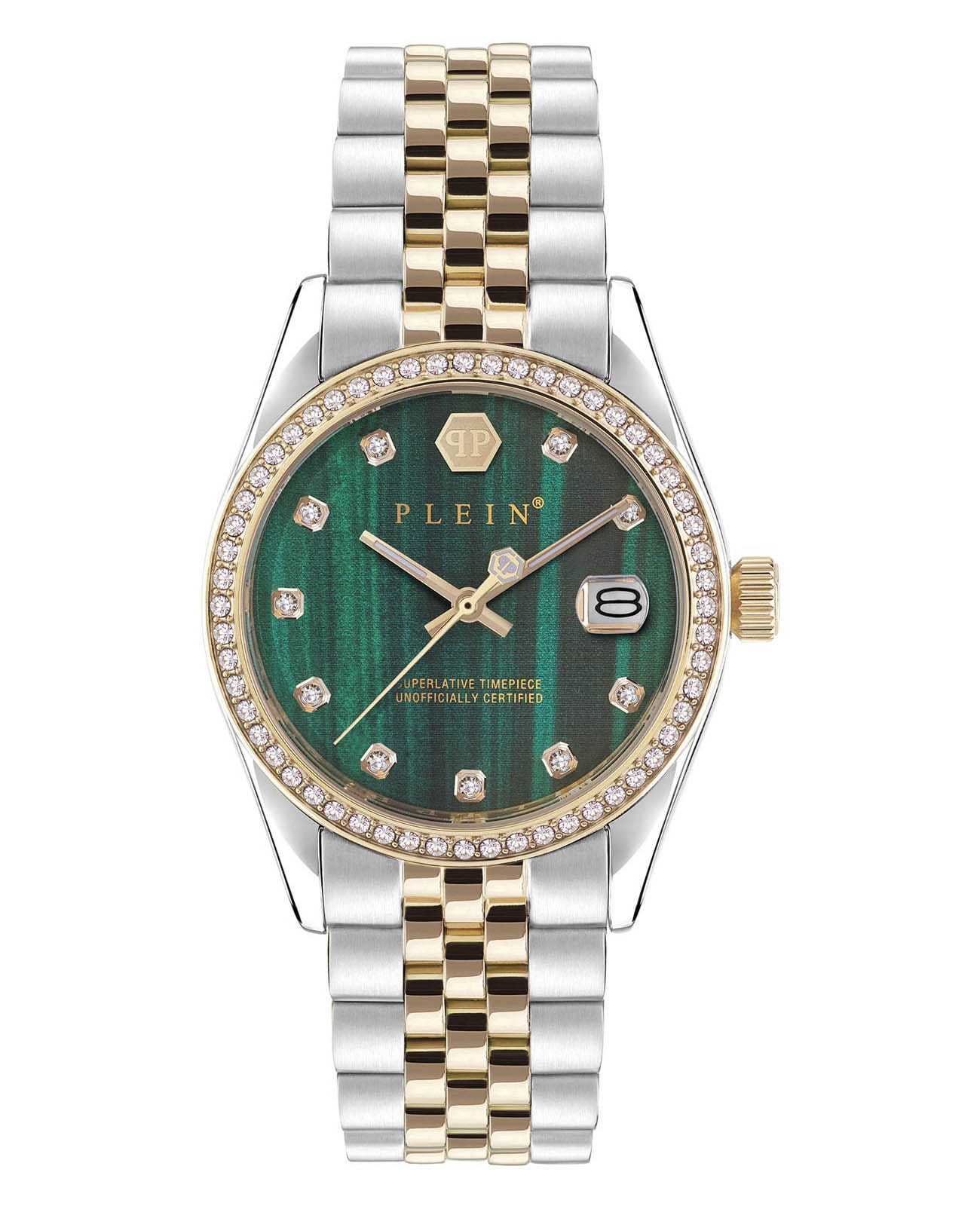 Яркие женские часы Philipp Plein Date Superlative PWYAA0523 c с минеральным стекломМинеральное стеклоМинеральное стекло представляет собой искусственно выращенный минерал кварца. Такое стекло отличается особой устойчивостью к повреждениям и царапинам. Уступает по некоторым качествам сапфировому стеклу.. Особенные часы для особенных женщин! Ослепительный аксессуар, демонстрирующий роскошь и изысканность.Часы с круглым стальным корпусом с IP-покрытиемIP-покрытиеМетод ионного напыления. Демонстрирует повышенную устойчивость к истиранию, окислению и химическим веществам. Под воздействием высокого давления и температуры около 1500°C молекулы металла надёжно соединяются с частицами корпуса часов.. Перламутровый циферблат с метками в виде точек, украшенных кристаллами. Люминесцентное покрытиеЛюминесцентное покрытиеПозволяет считывать показания времени в темноте. Производители наносят на стрелки, часовые индексы, безель или поверхность циферблата светонакопительный состав, дающий холодное свечение. стрелок. Окошко даты с увеличительным стеклом находится в положении 3 часа. Рифленая заводная головка. Стальной браслет на застёжке бабочка с кнопкамиЗастёжка "бабочка"Такой вид застёжки дополняется предохранителями, помогающими избежать случайного раскрытия браслета. Обладают изящным исполнением.