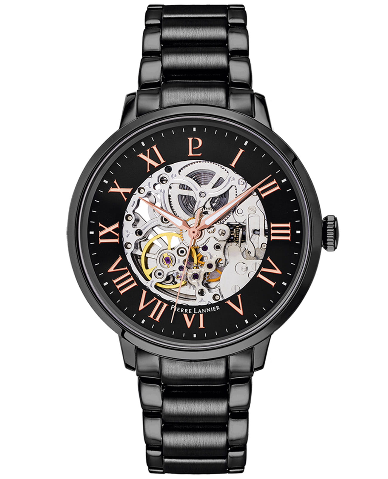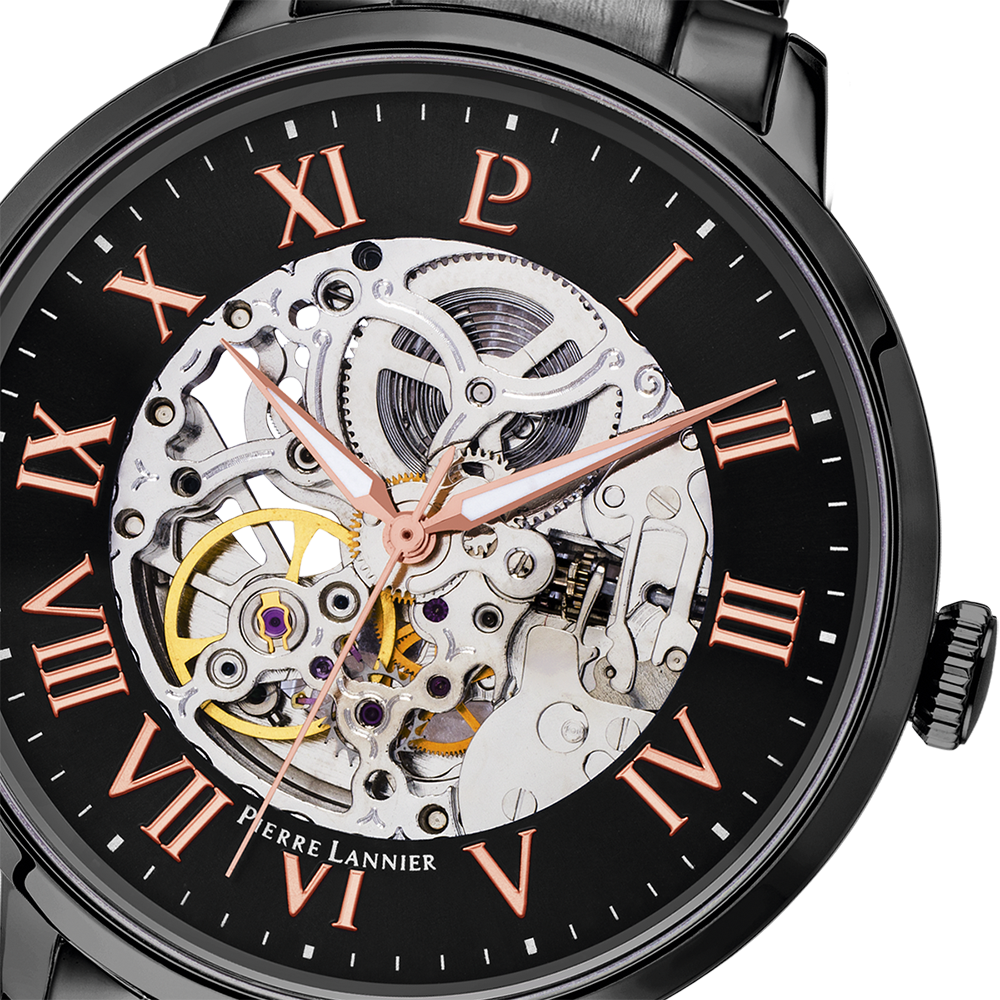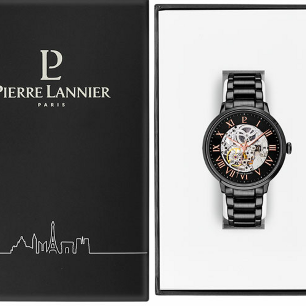 Мужские механические часы с автоподзаводом Pierre Lannier Automatic 316D439. Минеральное стеклоМинеральное стеклоМинеральное стекло представляет собой искусственно выращенный минерал кварца. Такое стекло отличается особой устойчивостью к повреждениям и царапинам. Уступает по некоторым качествам сапфировому стеклу. устойчивое к мелким механическим повреждениям. Центральные часовая, минутная и секундная стрелки. Корпус и браслет выполнены из нержавеющей стали с IP-покрытиемIP-покрытиеМетод ионного напыления. Демонстрирует повышенную устойчивость к истиранию, окислению и химическим веществам. Под воздействием высокого давления и температуры около 1500°C молекулы металла надёжно соединяются с частицами корпуса часов.. Водостойкость: 50 метров, позволит защитить корпус от случайных брызг или капель дождя. Стрелки с люминесцентным покрытиемЛюминесцентное покрытиеПозволяет считывать показания времени в темноте. Производители наносят на стрелки, часовые индексы, безель или поверхность циферблата светонакопительный состав, дающий холодное свечение.. Черный скелетонизированный циферблат. Браслет на раскладной застёжкеРаскладная застёжкаТакой тип застёжки используется только на браслетах из металла. Она никогда не раскрывается полностью, происходит разделение на 2 и более частей. Раскладывающая застёжка снизит вероятность потери часов к минимуму.. Прозрачная задняя крышка.