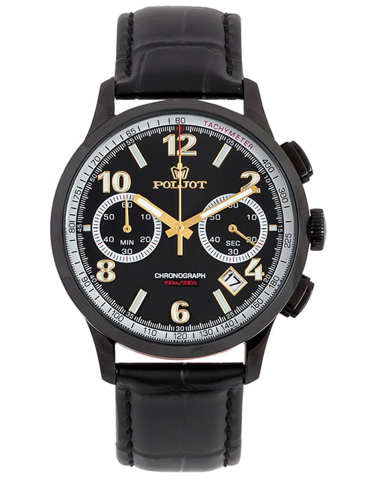 Poljot 6S21.904216 — современные мужские часы с выразительным спортивным дизайном и надёжной функциональностью. Корпус из нержавеющей стали с с PVD-покрытиемPVDУльтратонкое покрытие наносится в технике вакуумного напыления, сочетает в себе нитрид титана особой прочности со слоем золота или оксида хрома. Несёт в себе декоративную или защитную функцию. подчёркивает прочность и уверенный характер модели, а глубокий циферблат с счётчиками хронографаХронографФункция позволяет измерять отрезки времени с особой точностью: часы, минуты, секунды. Верным признаком хронографа является наличие на циферблате 3 дополнительных окошек-счётчиков. и аккуратным окном даты придаёт часам динамичный вид. Контрастные стрелки и метки с люминесцентным покрытиемЛюминесцентное покрытиеПозволяет считывать показания времени в темноте. Производители наносят на стрелки, часовые индексы, безель или поверхность циферблата светонакопительный состав, дающий холодное свечение. обеспечивают удобство считывания информации в любое время суток, а внешняя шкала тахиметраТахиметрРазмеченная шкала, располагается на ободке или безеле часов. Тахиметр позволяет рассчитать скорость на определённом участке пути, расстояние измеряется в километрах или милях. добавляет спортивную функциональность. Прочное минеральное стеклоМинеральное стеклоМинеральное стекло представляет собой искусственно выращенный минерал кварца. Такое стекло отличается особой устойчивостью к повреждениям и царапинам. Уступает по некоторым качествам сапфировому стеклу. защищает циферблат от царапин, а ремешок из натуральной кожи гарантирует комфорт и элегантную посадку на запястье. Poljot — это гармония классики и спортивного духа, созданная для мужчин, ценящих точность, надёжность и уверенный стиль.
