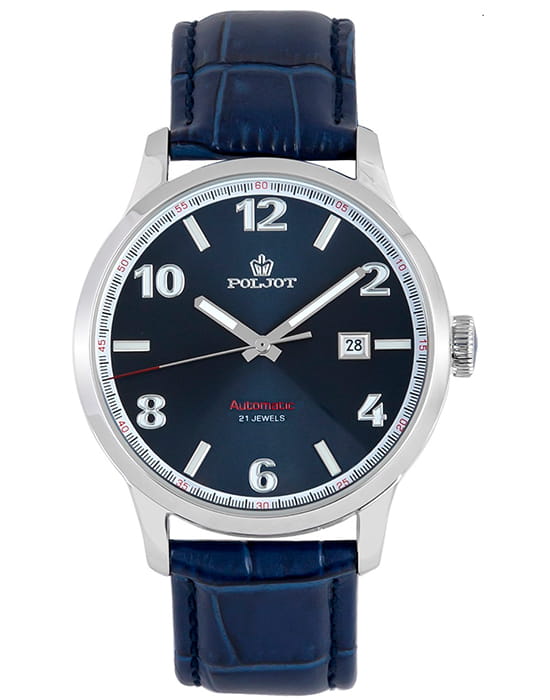 Poljot 8215.901220 — классические механические мужские часы с автоподзаводом, сочетающие сдержанный дизайн и надёжность российского часового производства. Корпус из нержавеющей стали подчёркивает строгость и универсальность модели, а циферблат с крупными арабскими цифрами и аккуратным окном даты на позиции «3 часов» обеспечивает превосходную читаемость. Стрелки и метки с люминесцентным покрытиемЛюминесцентное покрытиеПозволяет считывать показания времени в темноте. Производители наносят на стрелки, часовые индексы, безель или поверхность циферблата светонакопительный состав, дающий холодное свечение.. Механизм с автоподзаводом гарантирует стабильную работу и плавный ход стрелок. Прочное минеральное стеклоМинеральное стеклоМинеральное стекло представляет собой искусственно выращенный минерал кварца. Такое стекло отличается особой устойчивостью к повреждениям и царапинам. Уступает по некоторым качествам сапфировому стеклу. защищает циферблат от царапин, а ремешок из натуральной кожи глубокого синего цвета придаёт часам современное и элегантное звучание. Poljot — это воплощение надёжности, классики и уверенного стиля, созданное для мужчин, предпочитающих традиционную механику и безупречный внешний вид.
