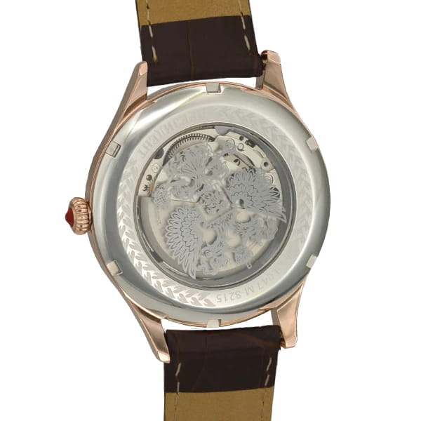 Мужские часы из коллекции «Президент» — это воплощение респектабельности и классического стиля. Модель выполнена в круглой форме с корпусом диаметром 42,2 мм и толщиной 13,8 мм, защищённым минеральным стекломМинеральное стеклоМинеральное стекло представляет собой искусственно выращенный минерал кварца. Такое стекло отличается особой устойчивостью к повреждениям и царапинам. Уступает по некоторым качествам сапфировому стеклу., устойчивым к мелким механическим повреждениям. Цвет корпуса — розовое золото, что придаёт модели благородный внешний вид и подчёркивает её уникальность. Часы оснащены функцией отображения даты и прозрачной задней крышкой, через которую можно наблюдать за работой механизма. На циферблате инкрустированы кристаллы Swarovski, добавляющие модели изысканности и блеска. Браслет коричневого цвета выполнен из натуральной кожи, а его ширина составляет 20 мм, что делает модель удобной и элегантной на запястье. Механизм с автоподзаводом обеспечивает надёжную работу и точность хода. Часы водонепроницаемы до 30 метров (), что позволяет использовать их в повседневных условиях — при мытье рук или под лёгким дождём. Эти часы станут универсальным аксессуаром для тех, кто ценит сочетание стиля, качества и эстетики — идеальный выбор для уверенных в себе мужчин, следящих за своим имиджем и предпочитающих выделяться.