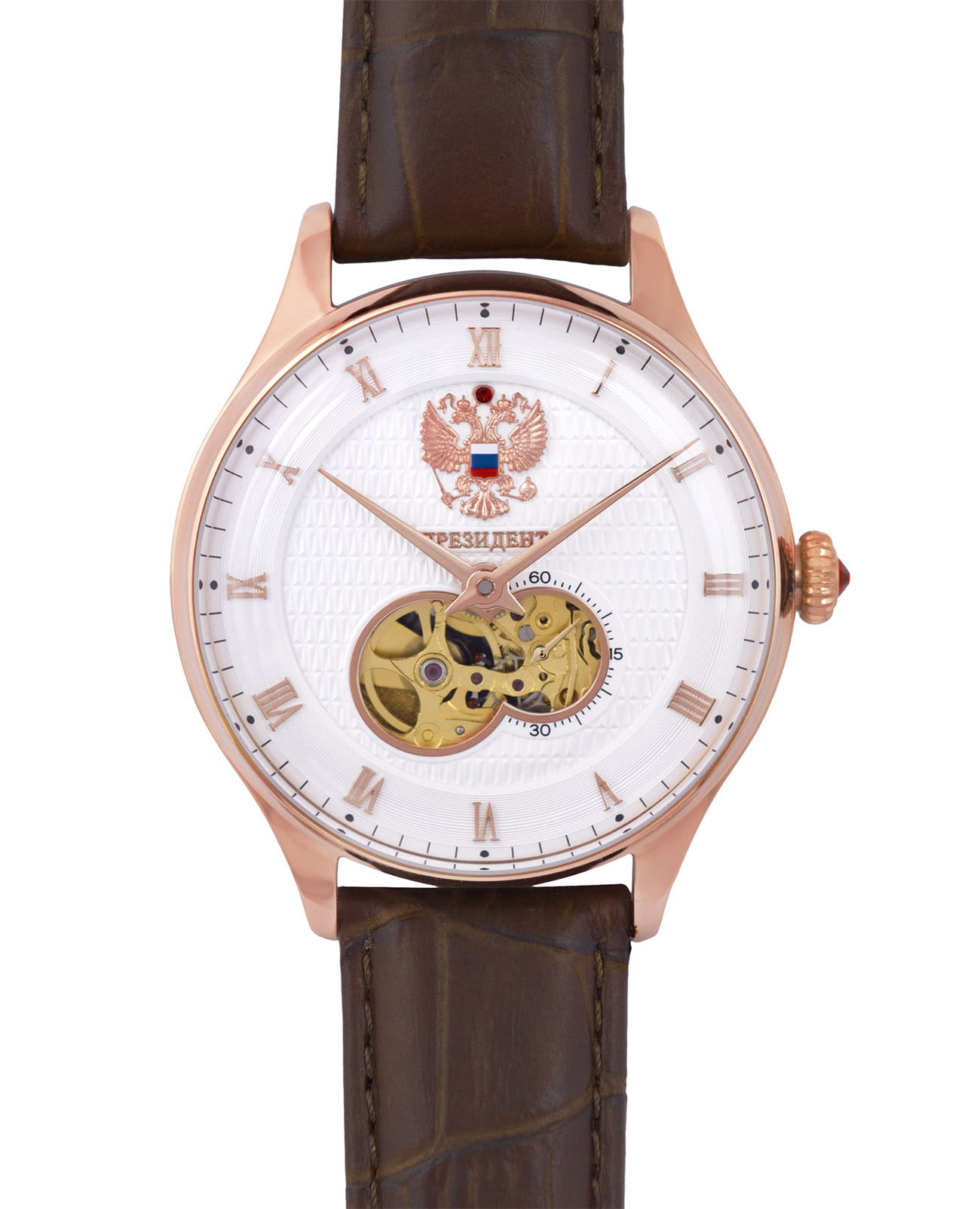 Мужские часы из коллекции «Президент» — это классический аксессуар, сочетающий в себе элегантность и надёжность. Модель выполнена в круглой форме с корпусом диаметром 42,5 мм и толщиной 16,3 мм, защищённым минеральным стекломМинеральное стеклоМинеральное стекло представляет собой искусственно выращенный минерал кварца. Такое стекло отличается особой устойчивостью к повреждениям и царапинам. Уступает по некоторым качествам сапфировому стеклу., устойчивым к мелким повреждениям. Браслет коричневого цвета изготовлен из натуральной кожи и дополнен стандартной застёжкой, что делает его удобным и практичным для повседневного использования. Часы оснащены механизмом с автоподзаводом, обеспечивающим точность хода и минимальное обслуживание. Прозрачная задняя крышка украшена изображением Герба России, что подчёркивает национальную принадлежность и уникальность модели. Водонепроницаемость позволяет использовать модель в повседневных условиях — при мытье рук или под лёгким дождём. Эти часы станут универсальным аксессуаром для тех, кто ценит сочетание стиля, качества и символики — идеальный выбор для уверенных в себе мужчин, следящих за своим имиджем и предпочитающих выделяться.