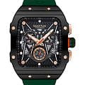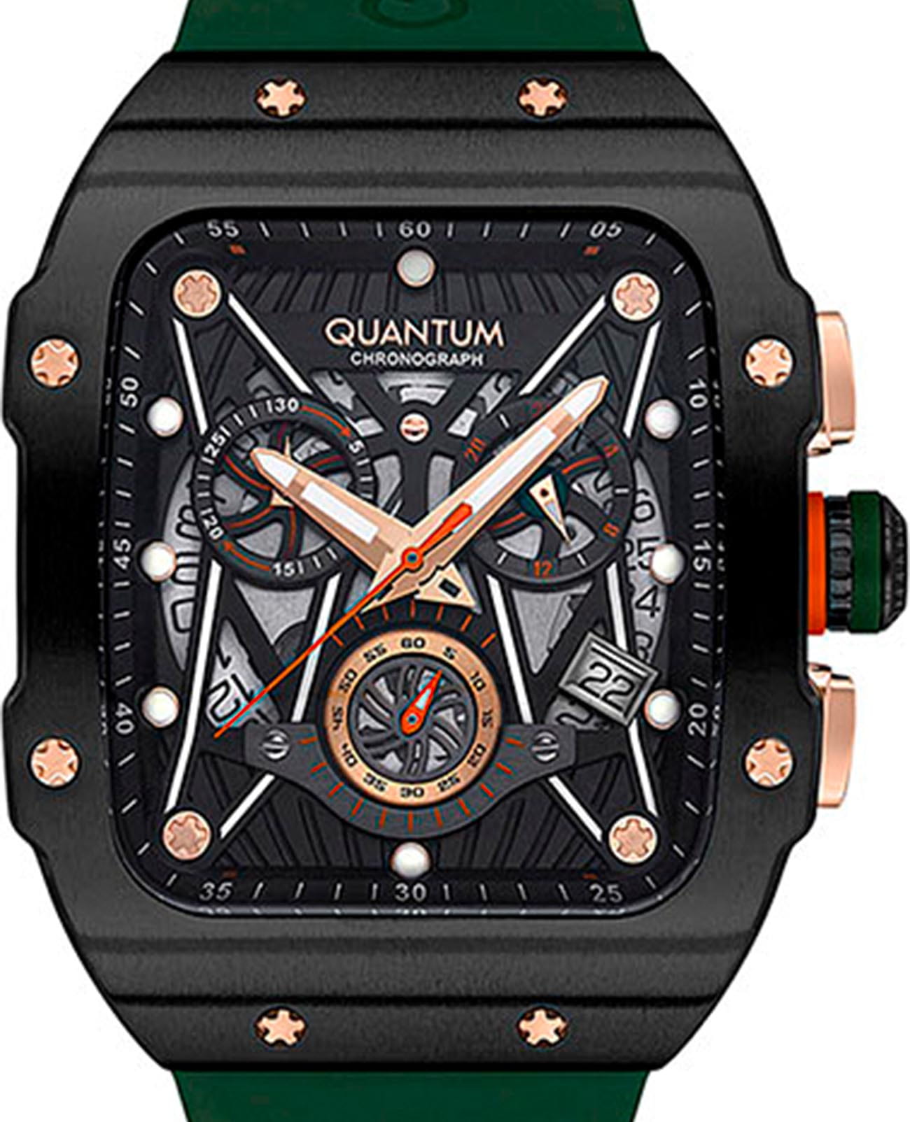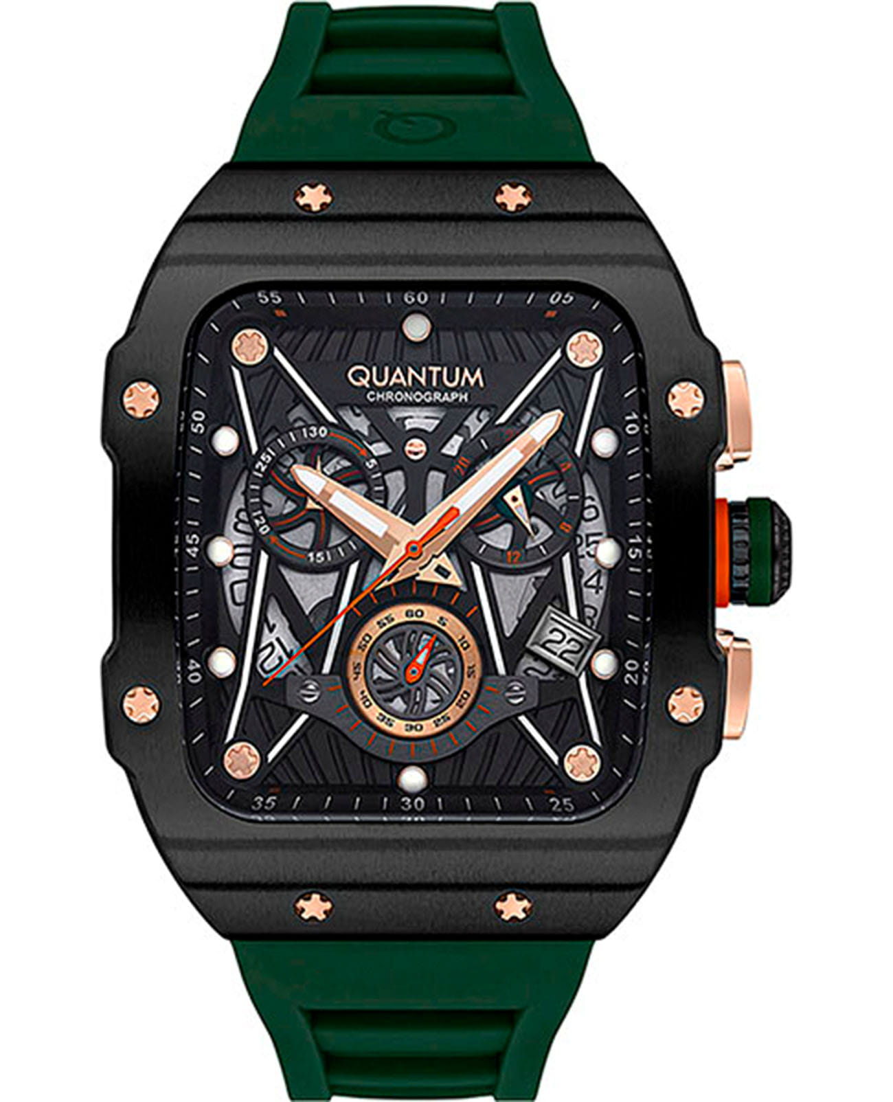 Мужские кварцевые часы Quantum из коллекции Hunter — выразительный прямоугольный корпус размером 44 мм из нержавеющей стали с PVD-покрытиемPVDУльтратонкое покрытие наносится в технике вакуумного напыления, сочетает в себе нитрид титана особой прочности со слоем золота или оксида хрома. Несёт в себе декоративную или защитную функцию. чёрного цвета с чёрным циферблатом. Часы оснащены хронографомХронографФункция позволяет измерять отрезки времени с особой точностью: часы, минуты, секунды. Верным признаком хронографа является наличие на циферблате 3 дополнительных окошек-счётчиков., секундомером и окошком даты, а минеральное стеклоМинеральное стеклоМинеральное стекло представляет собой искусственно выращенный минерал кварца. Такое стекло отличается особой устойчивостью к повреждениям и царапинам. Уступает по некоторым качествам сапфировому стеклу. с антибликовым покрытием обеспечивает отличную читаемость в любых условиях. Механизм — японский кварцевый Seiko. Водонепроницаемость 100 м делает модель универсальной для повседневного ношения и активного отдыха. Зелёный силиконовый ремешок на стандартной застёжке подчёркивает спортивный характер, оставаясь при этом удобным и практичным. Идеальный выбор для тех, кто ценит турецкий дизайн и современный функциональный стиль.