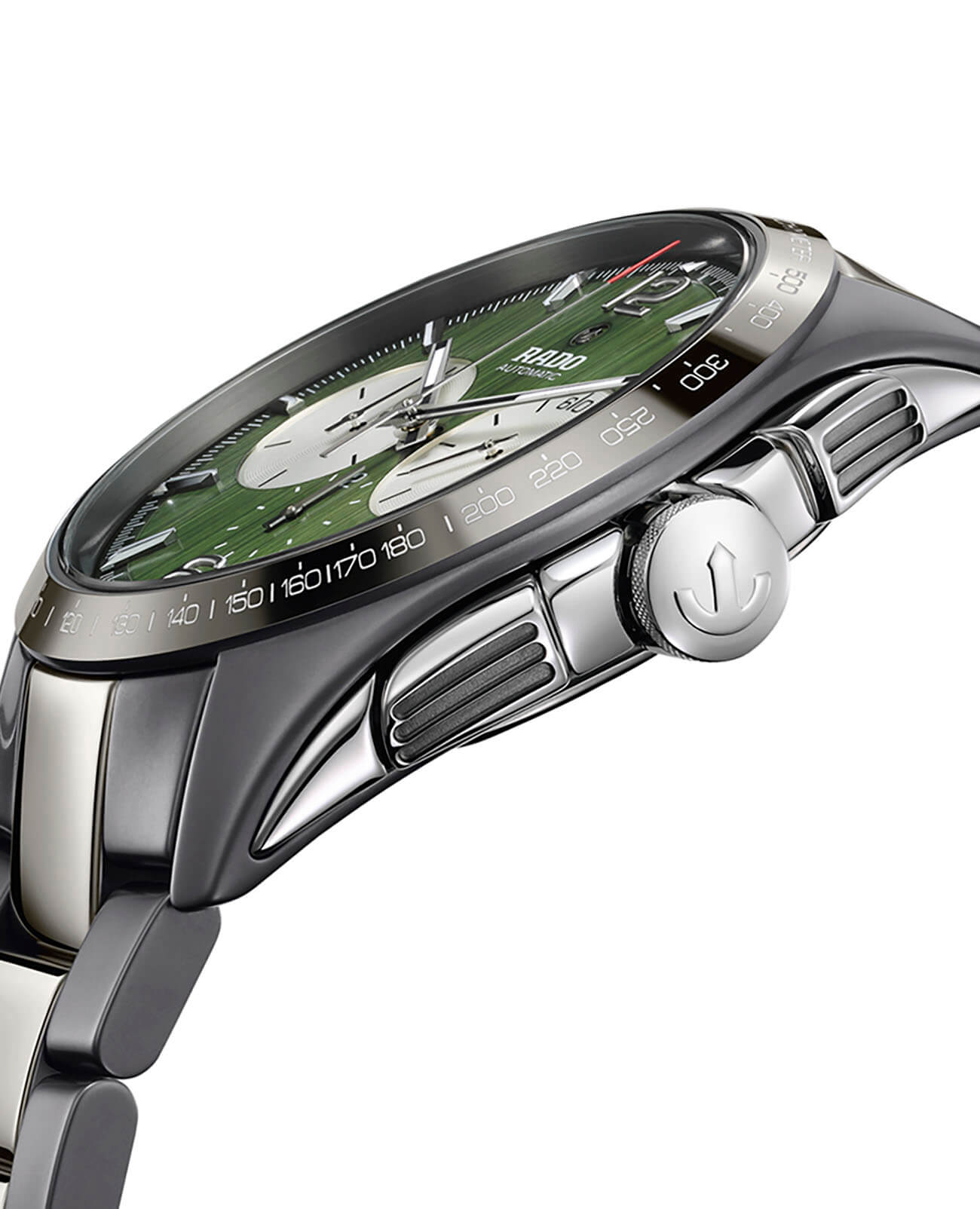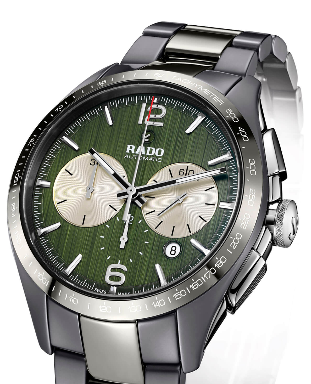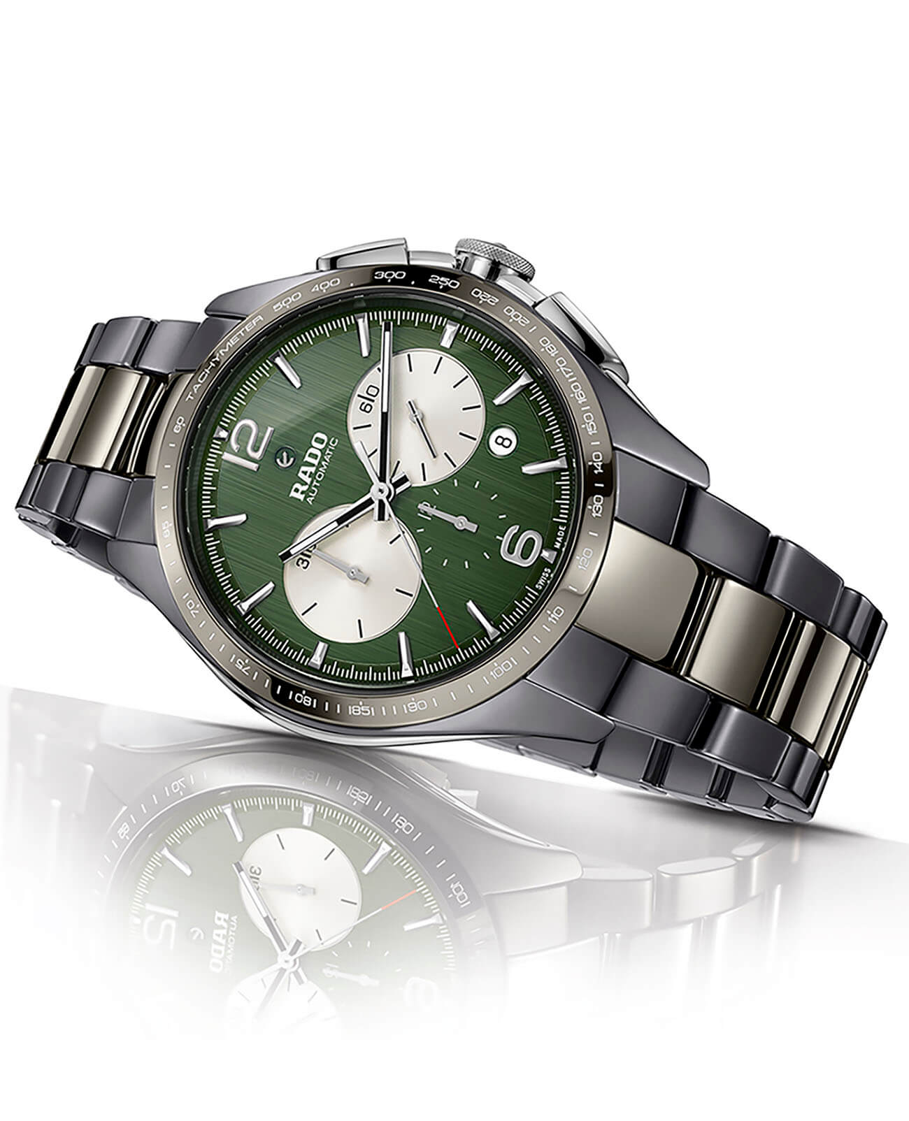 Наручные часы с лаконичным продольным узором зелёного циферблата дополнены счётчиками хронографаХронографФункция позволяет измерять отрезки времени с особой точностью: часы, минуты, секунды. Верным признаком хронографа является наличие на циферблате 3 дополнительных окошек-счётчиков. в контрастном исполнении, секундная стрелка имеет красный наконечник. Корпус модели сделан из революционной плазменной керамикиВысокотехнологичная плазменная керамикаИнновационный материал, технология запатентована. Выплавление керамики осуществляется в печи при 20 000 °C, белоснежный материал под воздействием ультравысокой температуры приобретает уникальный блеск, присущий металлам. и нержавеющей стали 316L, браслет объединяет плазменную керамику и материал CeramosCeramosМатериал являет собой инновационное сочетание высокотехнологичной керамики и сплава металла. Он объединяет керамическую устойчивость к царапинам и металлический роскошный блеск. . Высокая точность хода обеспечивается за счёт автоматического калибра ETA 2894-2 с резервом хода 45 часов, его работу можно понаблюдать через прозрачную заднюю крышку. Сапфировое стекло с антибликовой обработкой. Круглая апертура даты, секундомер, тахиметрТахиметрРазмеченная шкала, располагается на ободке или безеле часов. Тахиметр позволяет рассчитать скорость на определённом участке пути, расстояние измеряется в километрах или милях.. Водонепроницаемость до 10 бар. . Диаметр корпуса: 45 мм.