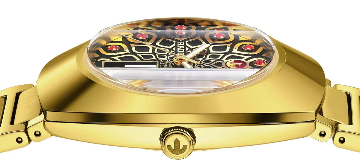 Мужские механические часы-скелетоны с автоподзаводом Rado DiaStar The Original Automatic R12161653. Корпус часов выполнен из нержавеющей стали с PVD-покрытиемPVDУльтратонкое покрытие наносится в технике вакуумного напыления, сочетает в себе нитрид титана особой прочности со слоем золота или оксида хрома. Несёт в себе декоративную или защитную функцию.. Стрелки с люминесцентным покрытиемЛюминесцентное покрытиеПозволяет считывать показания времени в темноте. Производители наносят на стрелки, часовые индексы, безель или поверхность циферблата светонакопительный состав, дающий холодное свечение. Super-LumiNova. Класс водозащиты: 100 метров, позволит плавать, нырять и заниматься другими водными видами спорта. Стальной браслет с PVD-покрытиемPVDУльтратонкое покрытие наносится в технике вакуумного напыления, сочетает в себе нитрид титана особой прочности со слоем золота или оксида хрома. Несёт в себе декоративную или защитную функцию. на застёжке-бабочке с кнопкамиЗастёжка "бабочка"Такой вид застёжки дополняется предохранителями, помогающими избежать случайного раскрытия браслета. Обладают изящным исполнением. .