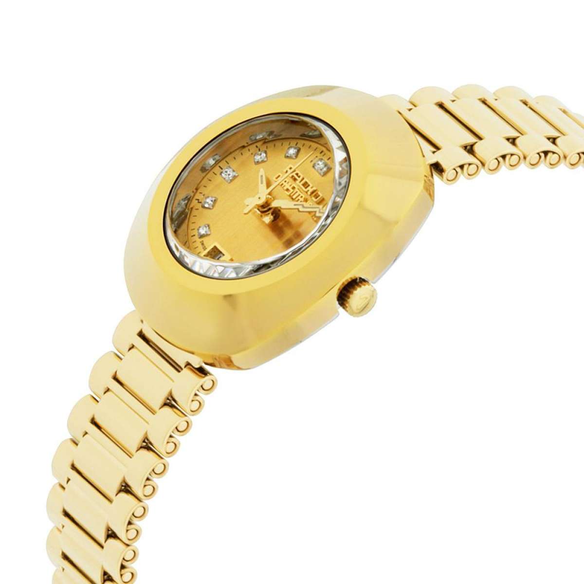 Женские часы Rado The Original R12306303 с надёжным кварцевым механизмом. Корпус и браслет часов выполнены из нержавеющей стали с PVD-покрытиемPVDУльтратонкое покрытие наносится в технике вакуумного напыления, сочетает в себе нитрид титана особой прочности со слоем золота или оксида хрома. Несёт в себе декоративную или защитную функцию.. Стрелки с люминесцентным покрытиемЛюминесцентное покрытиеПозволяет считывать показания времени в темноте. Производители наносят на стрелки, часовые индексы, безель или поверхность циферблата светонакопительный состав, дающий холодное свечение. Super-LumiNova. Стальной браслет на раскладной застёжкеРаскладная застёжкаТакой тип застёжки используется только на браслетах из металла. Она никогда не раскрывается полностью, происходит разделение на 2 и более частей. Раскладывающая застёжка снизит вероятность потери часов к минимуму.. Класс водозащиты: 30 метров, позволит защитить корпус от случайных брызг или капель дождя. Циферблат инкрустирован сапфирами. Окошко даты находятся в положении 6 часов.