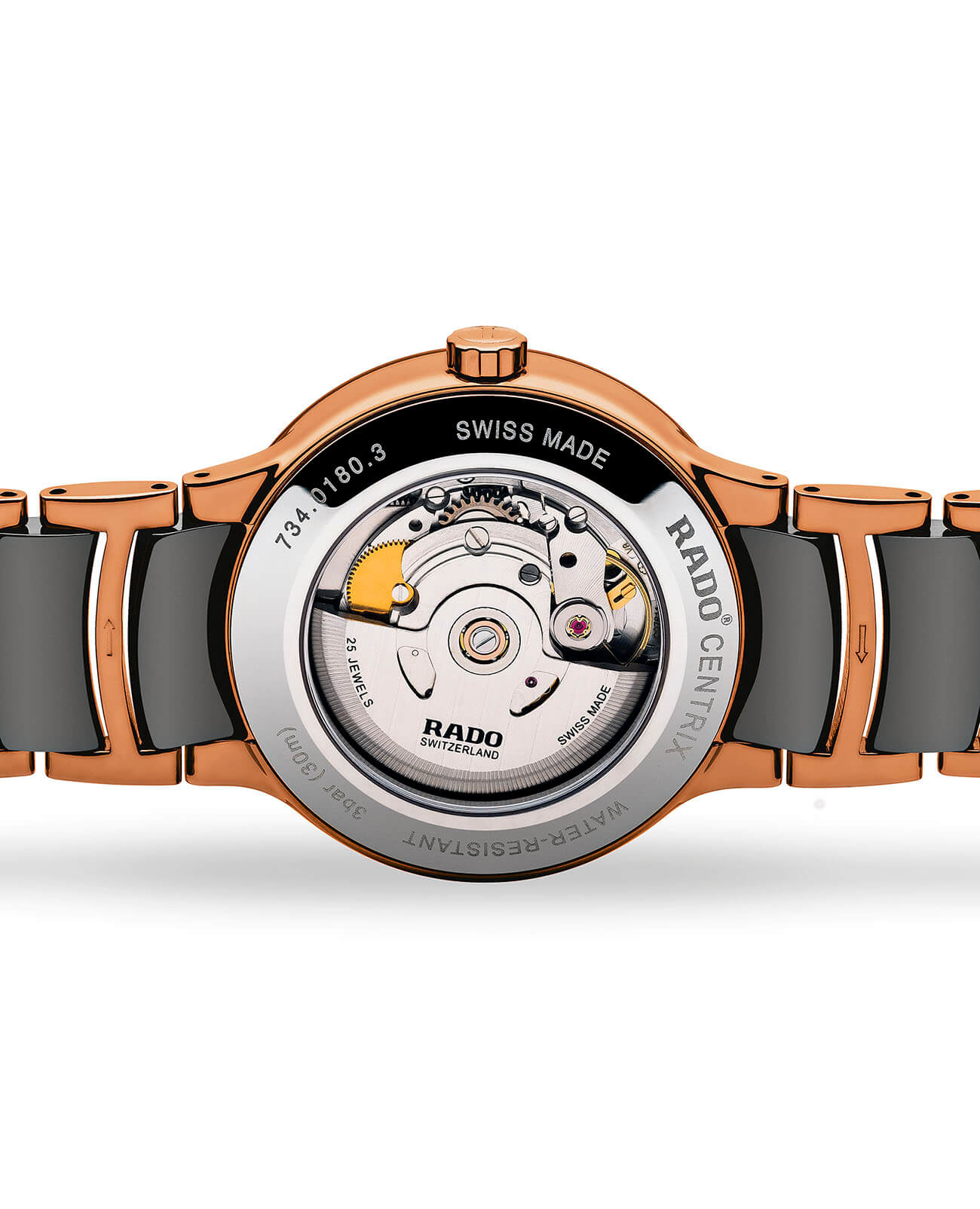 Наручные часы премиальной категории объединяют безупречность стиля и высокую точность хода, позволяя чувствовать себя на высоте в любой ситуации. Циферблат украшен 12 роскошными бриллиантами в 0,045 карат. Привлекательно выглядит сочетание нержавеющей стали 316L с цветным PVD-покрытиемPVDУльтратонкое покрытие наносится в технике вакуумного напыления, сочетает в себе нитрид титана особой прочности со слоем золота или оксида хрома. Несёт в себе декоративную или защитную функцию. и высокотехнологичной керамикиВысокотехнологичная керамикаИнновационный запатентованный Rado материал с гладкой или матовой поверхностью. Керамика за счёт кристаллической структуры обладает повышенной устойчивостью от возникновения царапин. Материал способен принимать температуру тела человека, обеспечивая невероятный комфорт при ношении., такое решение нашло воплощение в браслете. Модель оснащена автоматическим механизмом ETA C07.611, сохраняющим 80-часовой запас хода. Прозрачная задняя крышка. Стекло из сапфира. Индикация числа. Диаметр корпуса: 38 мм.
