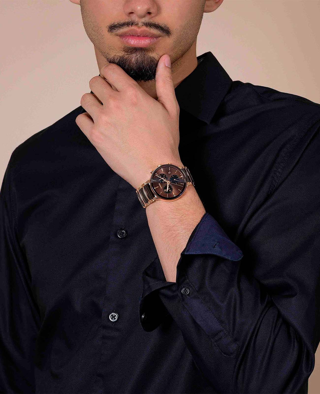 Мужские кварцевые часы Rado Centrix Chronograph — это гармоничное сочетание художественного выражения и изысканного дизайна. Корпус диаметром 41 мм и толщиной 11,4 мм выполнен из нержавеющей стали с PVD-покрытиемPVDУльтратонкое покрытие наносится в технике вакуумного напыления, сочетает в себе нитрид титана особой прочности со слоем золота или оксида хрома. Несёт в себе декоративную или защитную функцию.. Циферблат коричневого цвета с эффектом «солнечные лучи» оформлен накладными индексами цвета родия с люминесцентным покрытиемЛюминесцентное покрытиеПозволяет считывать показания времени в темноте. Производители наносят на стрелки, часовые индексы, безель или поверхность циферблата светонакопительный состав, дающий холодное свечение. Super-Luminova®, обеспечивающим отличную читаемость в темноте. Циферблат защищён выпуклым сапфировым стекломСапфировое стеклоПрочный и надёжный материал из кристалла сапфира синтетического происхождения, характеризующийся особой твёрдостью и устойчивостью к царапинам и повреждениям. с антибликовым покрытиемАнтибликовое покрытиеСлой оксида металла в 0,13-0,3 микрон, благодаря которому стекло часов не бликует и не отражает свет. Антибликовое покрытие уменьшает отражение света в 10 раз, обеспечивая отличную читаемость показателей циферблата. с обеих сторон. Механизм — швейцарский кварцевый с функцией хронографаХронографФункция позволяет измерять отрезки времени с особой точностью: часы, минуты, секунды. Верным признаком хронографа является наличие на циферблате 3 дополнительных окошек-счётчиков., оснащённый 22 камнями и технологиями Precidrive и Heavydrive, обеспечивающими точность хода ±10 секунд в год. Циферблат включает три субциферблата: 30-минутный счётчик, индикатор одной десятой секунды и малые секунды в положении 6 часов. Окошко даты расположено в положении 4 часов. Часы оснащены браслетом из полированной нержавеющей стали с с PVD-покрытиемPVDУльтратонкое покрытие наносится в технике вакуумного напыления, сочетает в себе нитрид титана особой прочности со слоем золота или оксида хрома. Несёт в себе декоративную или защитную функцию. и со вставками из высокотехнологичной керамикиВысокотехнологичная керамикаИнновационный запатентованный Rado материал с гладкой или матовой поверхностью. Керамика за счёт кристаллической структуры обладает повышенной устойчивостью от возникновения царапин. Материал способен принимать температуру тела человека, обеспечивая невероятный комфорт при ношении. коричневого цвета и застёжкой «бабочка» с кнопкамиЗастёжка "бабочка"Такой вид застёжки дополняется предохранителями, помогающими избежать случайного раскрытия браслета. Обладают изящным исполнением. из матовой стали. Водонепроницаемость 50 м позволяет использовать часы в повседневных условиях. Гарантия — 5 лет. Идеальный выбор для тех, кто ценит точность, стиль и швейцарское качество.