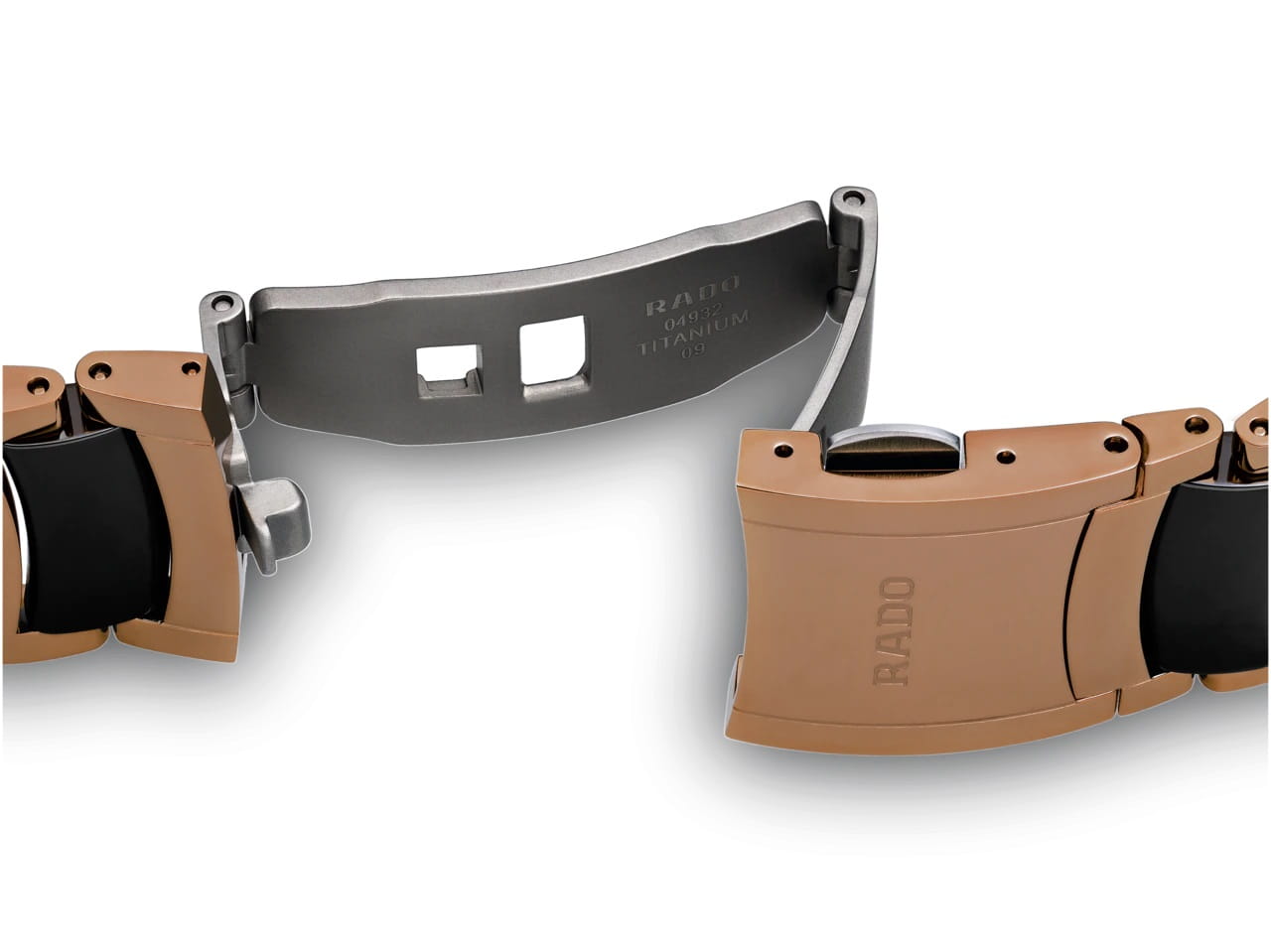 Аксессуар в чёрно-золотом цвете всегда будет иметь актуальность, он представляет собой эталон классики. Строгий деловой костюм, дополненный часами Rado со вставками из высокотехнологичной керамикиВысокотехнологичная керамикаИнновационный запатентованный Rado материал с гладкой или матовой поверхностью. Керамика за счёт кристаллической структуры обладает повышенной устойчивостью от возникновения царапин. Материал способен принимать температуру тела человека, обеспечивая невероятный комфорт при ношении. на браслете, поможет создать образ делового и солидного человека. Высокоточный автоматический калибр ETA C07.611 с 80-часовым резервом хода. Скелетонизированная задняя крышка. Корпус из хирургической стали 316L. PVD-финишPVDУльтратонкое покрытие наносится в технике вакуумного напыления, сочетает в себе нитрид титана особой прочности со слоем золота или оксида хрома. Несёт в себе декоративную или защитную функцию. цвета розового золота. Сапфировое стекло. Прямоугольное окошко даты. Диаметр корпуса: 28 мм.