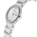 Великолепия добавляют 4 бриллианта, заменяющие часовые индексы. Сияние драгоценных камней завораживает и дарит настроение праздника. Корпус из нержавеющей стали. Стальной браслет со вставками из высокотехнологичной керамикиВысокотехнологичная керамикаИнновационный запатентованный Rado материал с гладкой или матовой поверхностью. Керамика за счёт кристаллической структуры обладает повышенной устойчивостью от возникновения царапин. Материал способен принимать температуру тела человека, обеспечивая невероятный комфорт при ношении. на раскладной застёжкеРаскладная застёжкаТакой тип застёжки используется только на браслетах из металла. Она никогда не раскрывается полностью, происходит разделение на 2 и более частей. Раскладывающая застёжка снизит вероятность потери часов к минимуму.. Сапфировое стеклоСапфировое стеклоПрочный и надёжный материал из кристалла сапфира синтетического происхождения, характеризующийся особой твёрдостью и устойчивостью к царапинам и повреждениям. устойчивое к мелким механическим повреждениям. Класс водозащиты: 30 метров, позволит защитить корпус от случайных брызг или капель дождя. Окошко даты находится в положении 3 часа.