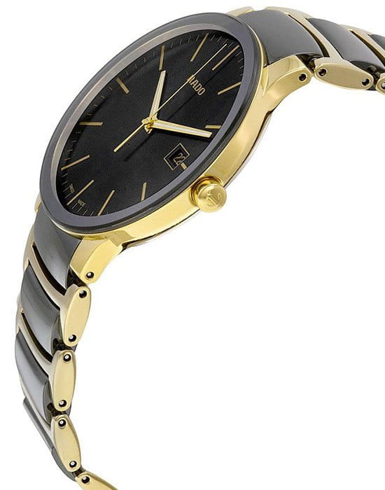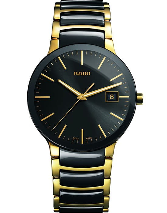Традиционный круглый циферблат чёрного цвета с золотистыми стрелками и метками имеет узор «солнечные лучи», лаконичное исполнение делает аксессуар универсальным вариантом для любого события. Корпус и браслет выполнены из хирургической стали 316L, браслет сделан в сочетании с высокотехнологичной керамикойВысокотехнологичная керамикаИнновационный запатентованный Rado материал с гладкой или матовой поверхностью. Керамика за счёт кристаллической структуры обладает повышенной устойчивостью от возникновения царапин. Материал способен принимать температуру тела человека, обеспечивая невероятный комфорт при ношении.. В основе работы находится кварцевый механизм ETA 955.112 с высокой точностью хода. Сапфировое стекло устойчиво к образованию царапин на поверхности. Сохранение водонепроницаемости при давлении до 3 бар. PVD-покрытиеPVDУльтратонкое покрытие наносится в технике вакуумного напыления, сочетает в себе нитрид титана особой прочности со слоем золота или оксида хрома. Несёт в себе декоративную или защитную функцию. цвета «жёлтое золото». Отображение даты. Диаметр корпуса: 38 мм.