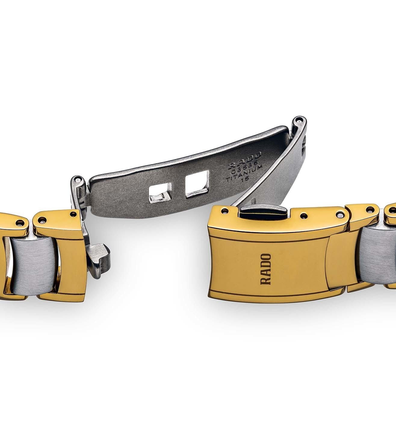 Швейцарские женские часы с надёжным кварцевым механизмом Rado Centrix Diamonds R30932923. Корпус часов изготовлен из нержавеющей стали. Браслет из стали с частичным PVD-покрытиемPVDУльтратонкое покрытие наносится в технике вакуумного напыления, сочетает в себе нитрид титана особой прочности со слоем золота или оксида хрома. Несёт в себе декоративную или защитную функцию. на раскладной застёжкеРаскладная застёжкаТакой тип застёжки используется только на браслетах из металла. Она никогда не раскрывается полностью, происходит разделение на 2 и более частей. Раскладывающая застёжка снизит вероятность потери часов к минимуму.. Сапфировое стеклоСапфировое стеклоПрочный и надёжный материал из кристалла сапфира синтетического происхождения, характеризующийся особой твёрдостью и устойчивостью к царапинам и повреждениям. устойчивое к мелким механическим повреждениям. Класс водозащиты: 30 метров, позволит защитить корпус от случайных брызг или капель дождя. Окошко даты находится в положении 3 часа. Стрелки и метки с люминесцентным покрытиемЛюминесцентное покрытиеПозволяет считывать показания времени в темноте. Производители наносят на стрелки, часовые индексы, безель или поверхность циферблата светонакопительный состав, дающий холодное свечение..