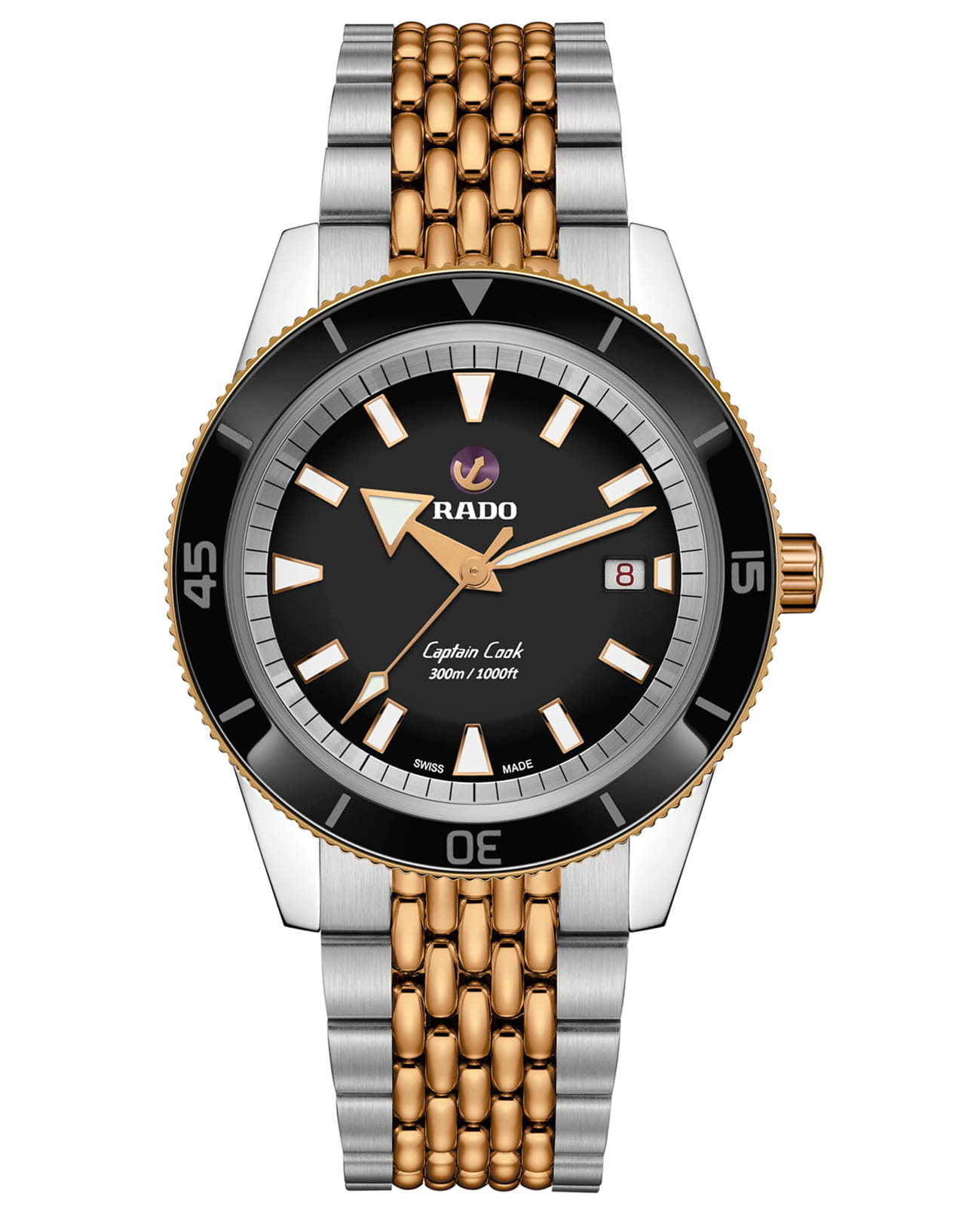 Мужские механические часы Rado Captain Cook Automatic R32137153. Корпус часов изготовлен из нержавеющей стали. Водозащита: 300 метров, позволит плавать, нырять и заниматься другими водными видами спорта. Стальной браслет на раскладной застёжкеРаскладная застёжкаТакой тип застёжки используется только на браслетах из металла. Она никогда не раскрывается полностью, происходит разделение на 2 и более частей. Раскладывающая застёжка снизит вероятность потери часов к минимуму.. Стрелки и метки с люминесцентным покрытиемЛюминесцентное покрытиеПозволяет считывать показания времени в темноте. Производители наносят на стрелки, часовые индексы, безель или поверхность циферблата светонакопительный состав, дающий холодное свечение.. Окошко даты находится в положении трёх часов. Поворотный безельБезельВнешний ободок, закрепляющий стекло. В спортивных часах так называется поворотное кольцо с делениями на циферблате, выполняет роль таймера – замеряет отрезки времени на шкале. Неподвижный безель – элемент декора. Однонаправленно вращающийся безель на дайверских часах позволяет фиксировать моменты погружения и выныривания на поверхность. из нержавеющей стали с PVD-покрытиемPVDУльтратонкое покрытие наносится в технике вакуумного напыления, сочетает в себе нитрид титана особой прочности со слоем золота или оксида хрома. Несёт в себе декоративную или защитную функцию..