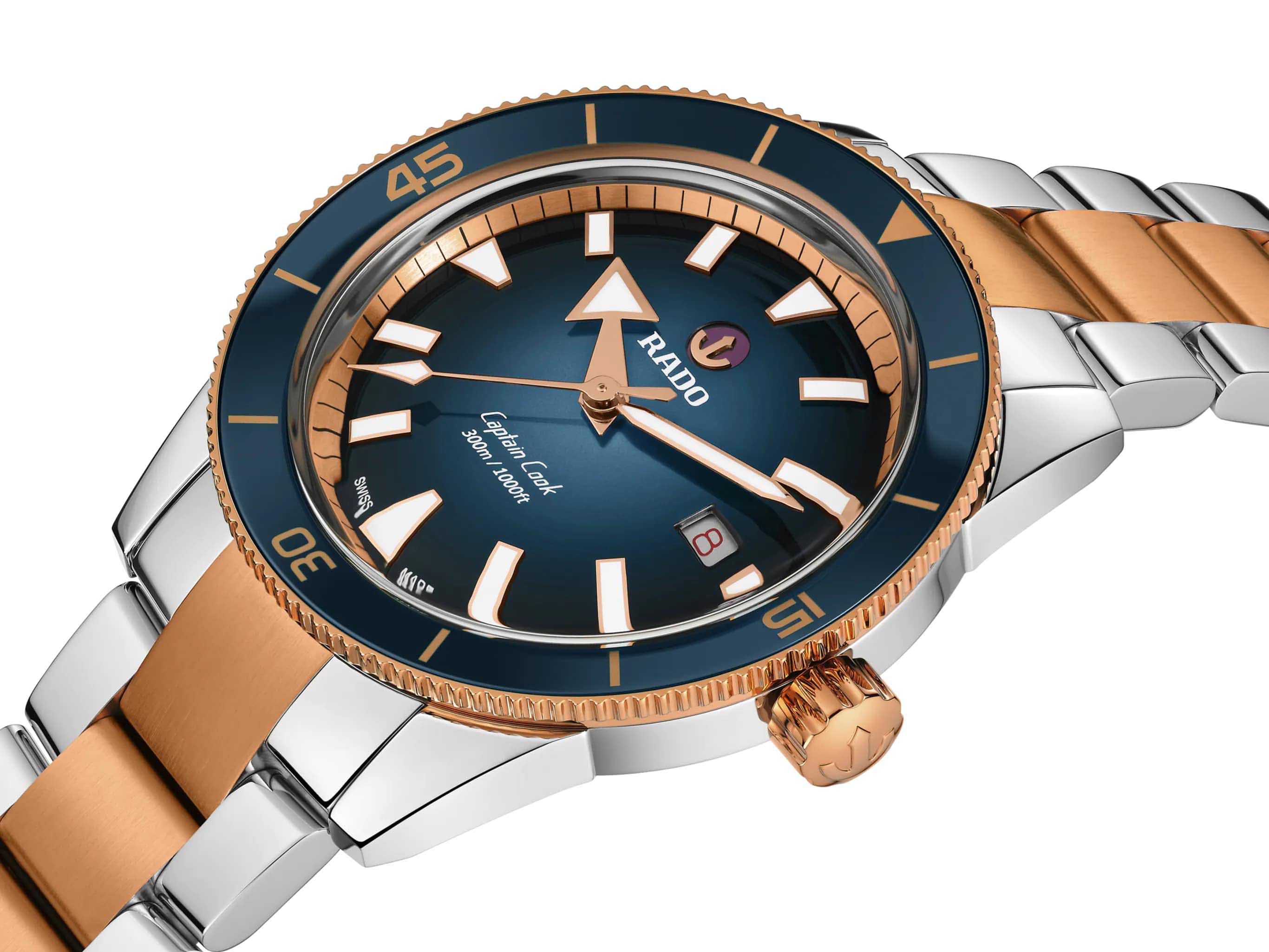 Эти 42-миллиметровые часы Captain Cook Automatic поставляются с лакированным сине-черным градиентным циферблатом, который идеально сочетается с браслетом из нержавеющей стали со средними звеньями цвета розового золота. Стрелки и индексы розово-золотого цвета с белым покрытием Super-LumiNova® обеспечивают отличную видимость. Для более высокой точности автоматическое перемещение Rado R763 внутри превышает стандартные требования к проверке точности с 3 до 5 позиций. Полированный корпус из нержавеющей стали с сапфировым стекломСапфировое стеклоПрочный и надёжный материал из кристалла сапфира синтетического происхождения, характеризующийся особой твёрдостью и устойчивостью к царапинам и повреждениям. в форме коробки обеспечивает уникальный эффект «пузыря» для выдающегося внешнего вида. Система EasyClip позволяет быстро и легко менять ремешки для настройки часов и персонализации стиля.