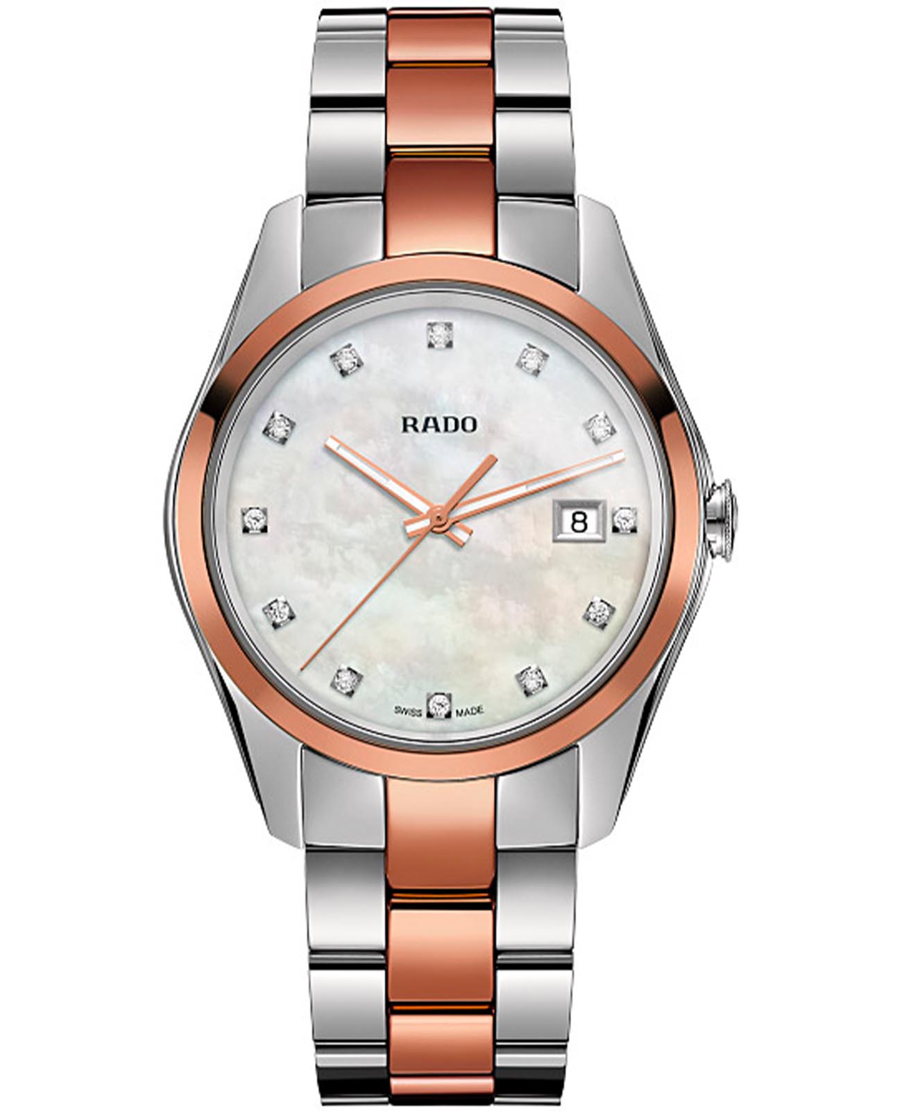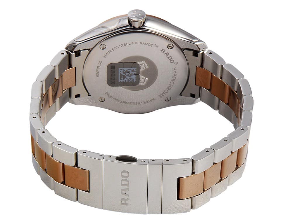Мужские швейцарские часы с надёжным кварцевым механизмом. Rado Hyperchrome R32184902. Сапфировое стеклоСапфировое стеклоПрочный и надёжный материал из кристалла сапфира синтетического происхождения, характеризующийся особой твёрдостью и устойчивостью к царапинам и повреждениям. устойчивое к мелким механическим повреждениям. Браслет часов изготовлены из нержавеющей стали и CeramosCeramosМатериал являет собой инновационное сочетание высокотехнологичной керамики и сплава металла. Он объединяет керамическую устойчивость к царапинам и металлический роскошный блеск. на раскладной застёжкеРаскладная застёжкаТакой тип застёжки используется только на браслетах из металла. Она никогда не раскрывается полностью, происходит разделение на 2 и более частей. Раскладывающая застёжка снизит вероятность потери часов к минимуму.. Безель изготовлен из CeramosCeramosМатериал являет собой инновационное сочетание высокотехнологичной керамики и сплава металла. Он объединяет керамическую устойчивость к царапинам и металлический роскошный блеск. . Окошко даты находится в положении 3 часа. Стрелки и метки с люминесцентным покрытиемЛюминесцентное покрытиеПозволяет считывать показания времени в темноте. Производители наносят на стрелки, часовые индексы, безель или поверхность циферблата светонакопительный состав, дающий холодное свечение.. Класс водозащиты: 50 метров, позволит защитить корпус от случайных брызг или капель дождя. Перламутровый циферблат со светящимися стрелками цвета розового золота и часовыми метками с бриллиантами.