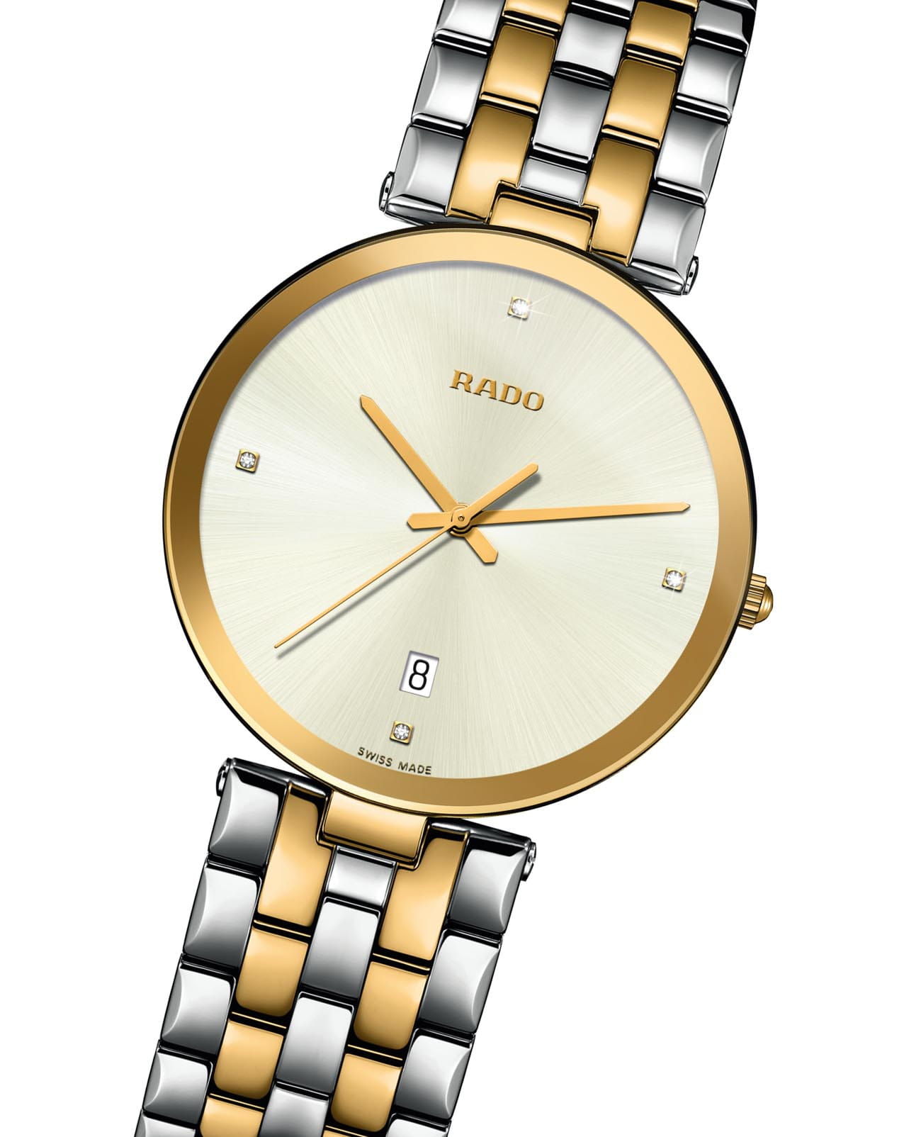 Мужские швейцарские кварцевые часы Rado Florence R48868723. Сапфировое стеклоСапфировое стеклоПрочный и надёжный материал из кристалла сапфира синтетического происхождения, характеризующийся особой твёрдостью и устойчивостью к царапинам и повреждениям. устойчивое к мелким механическим повреждениям. Стальной браслет на застёжке-бабочке. Корпус и браслет часов изготовлены из нержавеющей стали с частичным PVD-покрытиемPVDУльтратонкое покрытие наносится в технике вакуумного напыления, сочетает в себе нитрид титана особой прочности со слоем золота или оксида хрома. Несёт в себе декоративную или защитную функцию.. Окошко даты находится в положении 6 часов. Класс водозащиты: 30 метров, позволит защитить корпус от случайных брызг или капель дождя. Циферблат инкрустирован бриллиантами.