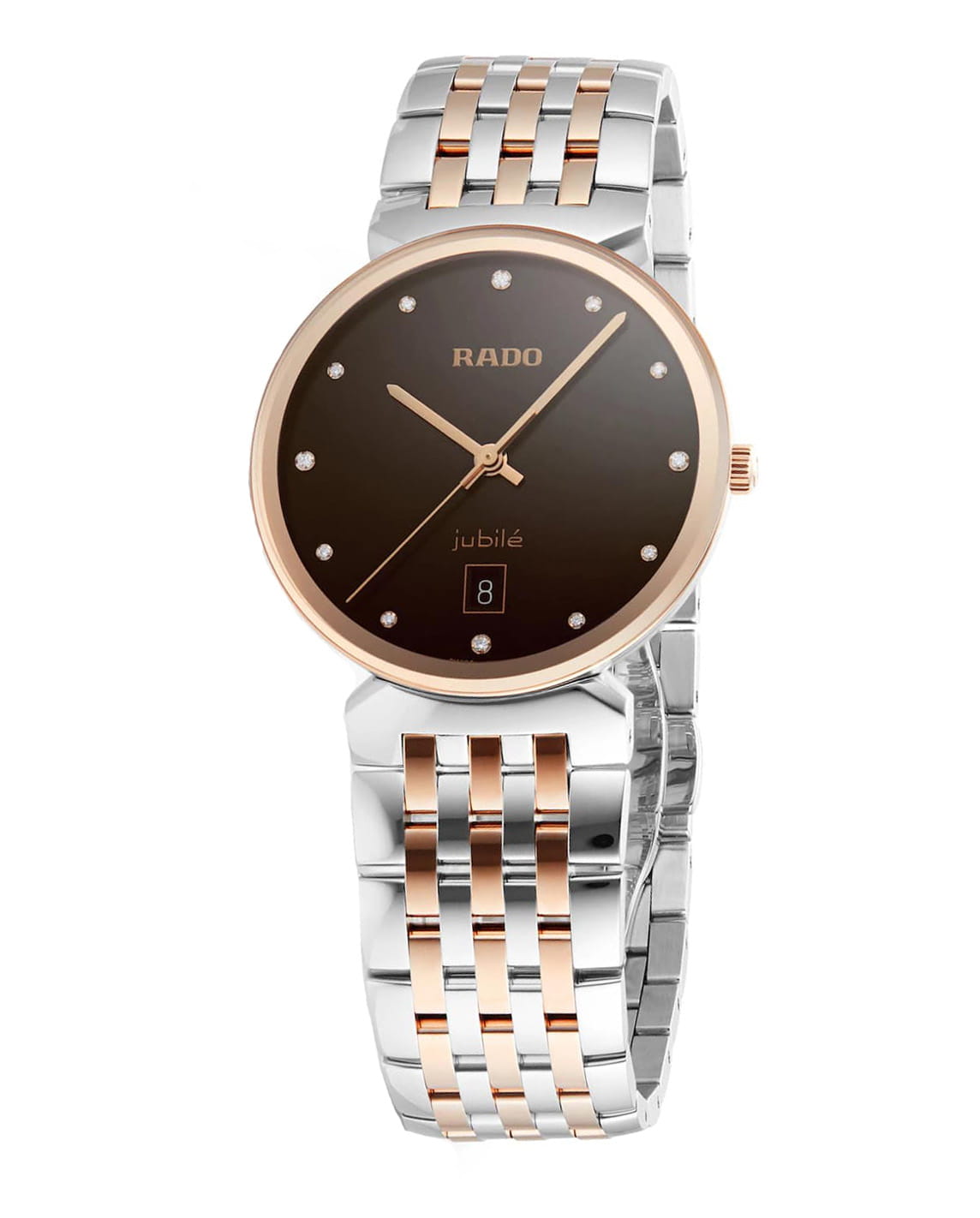 Гармоничный дизайн часов Rado Florence Classic напоминает об элегантных куполах и башнях города, в честь которого названа коллекция. Часы диаметром 38 мм имеют изогнутое сапфировое стеклоСапфировое стеклоПрочный и надёжный материал из кристалла сапфира синтетического происхождения, характеризующийся особой твёрдостью и устойчивостью к царапинам и повреждениям. со скошенными краями. Браслет из полированной нержавеющей стали со средними звеньями цвета розового золота с PVDPVDУльтратонкое покрытие наносится в технике вакуумного напыления, сочетает в себе нитрид титана особой прочности со слоем золота или оксида хрома. Несёт в себе декоративную или защитную функцию. покрытием завершает общий вид этих классических часов. Коричневый циферблат с солнечными лучами, украшенный 12 бриллиантами и украшенный печатным логотипом «jubilé», идеально сочетается со стрелками цвета розового золота. Благодаря кварцевому механизму калибра R073 с тремя стрелками часы обладают большей точностью и устойчивостью к ударам. Часы водонепроницаемы на глубине до 50 м, а также доступны в размере S, что делает их идеальными часами для пар.