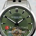 Циферблат оформлен по технологии Sunray (солнечные лучи) с уникальной спиральной отделкой. Накладные метки в виде штрихов и прямоугольные стрелки в стиле Baton добавляют строгий характер. Стрелки и метки имеют люминесцентное покрытиеЛюминесцентное покрытиеПозволяет считывать показания времени в темноте. Производители наносят на стрелки, часовые индексы, безель или поверхность циферблата светонакопительный состав, дающий холодное свечение., которое светится в темноте после небольшой зарядки на свету. Прозрачное окошко в положении 6 часов позволяет наблюдать за работой механизма часов.