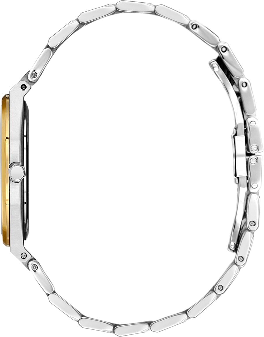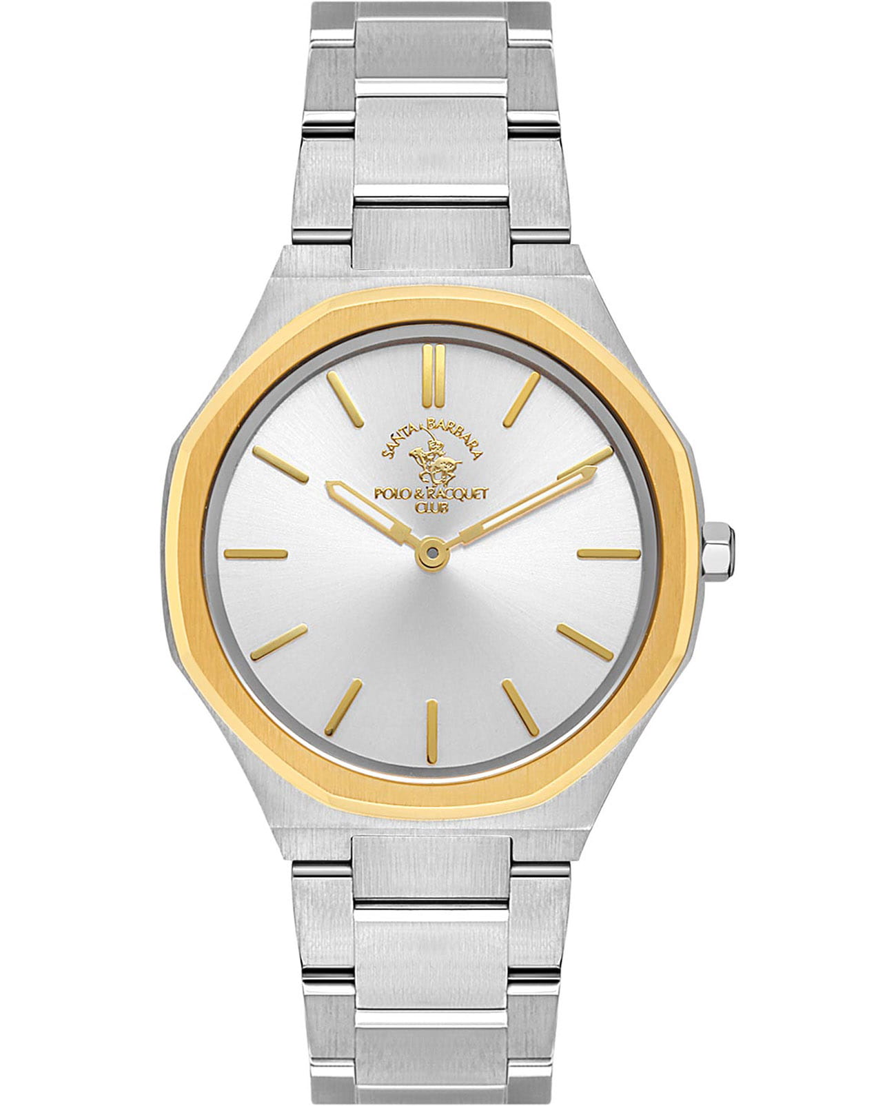 Женские кварцевые часы Santa Barbara Polo & Racquet Club — это воплощение дизайнерского минимализма и женственности. Корпус диаметром 34 мм и высотой 41,5 мм выполнен из стали с частичным IP-покрытиемIP-покрытиеМетод ионного напыления. Демонстрирует повышенную устойчивость к истиранию, окислению и химическим веществам. Под воздействием высокого давления и температуры около 1500°C молекулы металла надёжно соединяются с частицами корпуса часов.. БезельБезельВнешний ободок, закрепляющий стекло. В спортивных часах так называется поворотное кольцо с делениями на циферблате, выполняет роль таймера – замеряет отрезки времени на шкале. Неподвижный безель – элемент декора. Однонаправленно вращающийся безель на дайверских часах позволяет фиксировать моменты погружения и выныривания на поверхность. восьмиугольной формы придаёт изделию уникальный характер. Циферблат серебристого цвета оформлен по технологии Sunray («солнечные лучи»), дополнен накладными метками в виде штрихов и фирменным логотипом. Стрелки с люминесцентным покрытиемЛюминесцентное покрытиеПозволяет считывать показания времени в темноте. Производители наносят на стрелки, часовые индексы, безель или поверхность циферблата светонакопительный состав, дающий холодное свечение., обеспечивающим хорошую читаемость в темноте. Циферблат защищён минеральным стекломМинеральное стеклоМинеральное стекло представляет собой искусственно выращенный минерал кварца. Такое стекло отличается особой устойчивостью к повреждениям и царапинам. Уступает по некоторым качествам сапфировому стеклу.. Механизм — кварцевый калибр Miyota 1L22. Часы оснащены стальным браслетом на застёжке «бабочка» с кнопкамиЗастёжка "бабочка"Такой вид застёжки дополняется предохранителями, помогающими избежать случайного раскрытия браслета. Обладают изящным исполнением. . Водонепроницаемость 50 м позволяет использовать часы в повседневных условиях. Идеальный выбор для тех, кто ценит стиль, гармонию и качество.