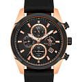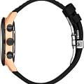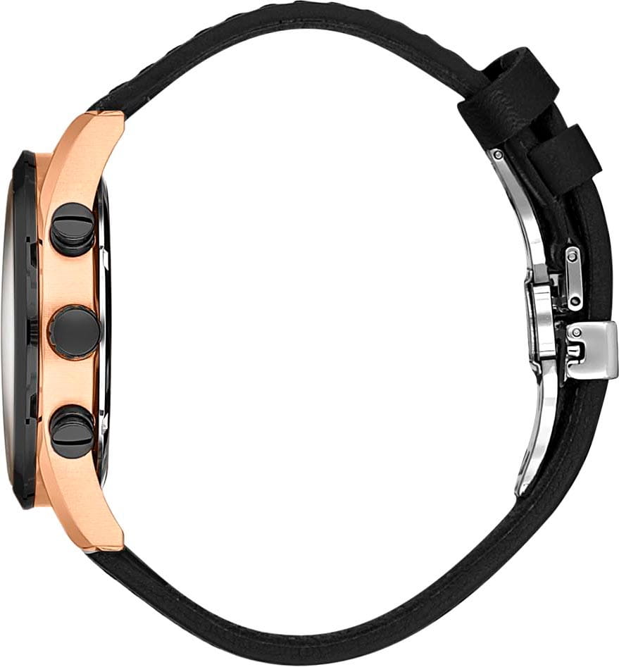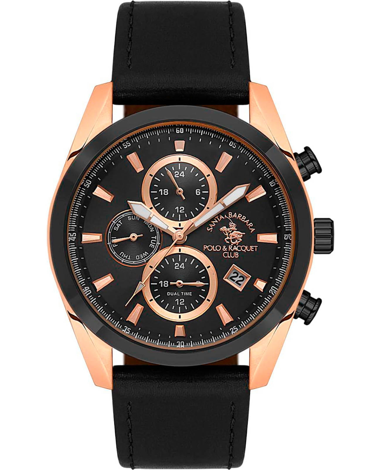 Мужские кварцевые часы Santa Barbara Polo & Racquet Club из коллекции Legend — это выразительный и функциональный аксессуар. Корпус размером 43×50,5 мм и толщиной 12 мм выполнен из нержавеющей стали 316L с IP-покрытиемIP-покрытиеМетод ионного напыления. Демонстрирует повышенную устойчивость к истиранию, окислению и химическим веществам. Под воздействием высокого давления и температуры около 1500°C молекулы металла надёжно соединяются с частицами корпуса часов. розового золота. Циферблат чёрного цвета оформлен по технологии Sunray («солнечные лучи»), дополнен накладными метками в виде штрихов и фирменным логотипом. Окошко даты расположено между 4 и 5 часами. Указатель дня недели и второй часовой пояс (GMT) вынесены на отдельные субциферблаты, также присутствует индикация 24-часового формата времени. Часы оснащены функцией хронографаХронографФункция позволяет измерять отрезки времени с особой точностью: часы, минуты, секунды. Верным признаком хронографа является наличие на циферблате 3 дополнительных окошек-счётчиков.. Стрелки и метки с люминесцентным покрытиемЛюминесцентное покрытиеПозволяет считывать показания времени в темноте. Производители наносят на стрелки, часовые индексы, безель или поверхность циферблата светонакопительный состав, дающий холодное свечение., обеспечивающим хорошую читаемость в темноте. Циферблат защищён минеральным стекломМинеральное стеклоМинеральное стекло представляет собой искусственно выращенный минерал кварца. Такое стекло отличается особой устойчивостью к повреждениям и царапинам. Уступает по некоторым качествам сапфировому стеклу.. Часы оснащены кожаным ремешком с застёжкой «бабочка» с кнопкамиЗастёжка "бабочка"Такой вид застёжки дополняется предохранителями, помогающими избежать случайного раскрытия браслета. Обладают изящным исполнением. . Водонепроницаемость 50 м позволяет использовать часы в повседневных условиях. Гарантия — 24 месяца. Идеальный выбор для тех, кто ценит стиль, функциональность и качество.