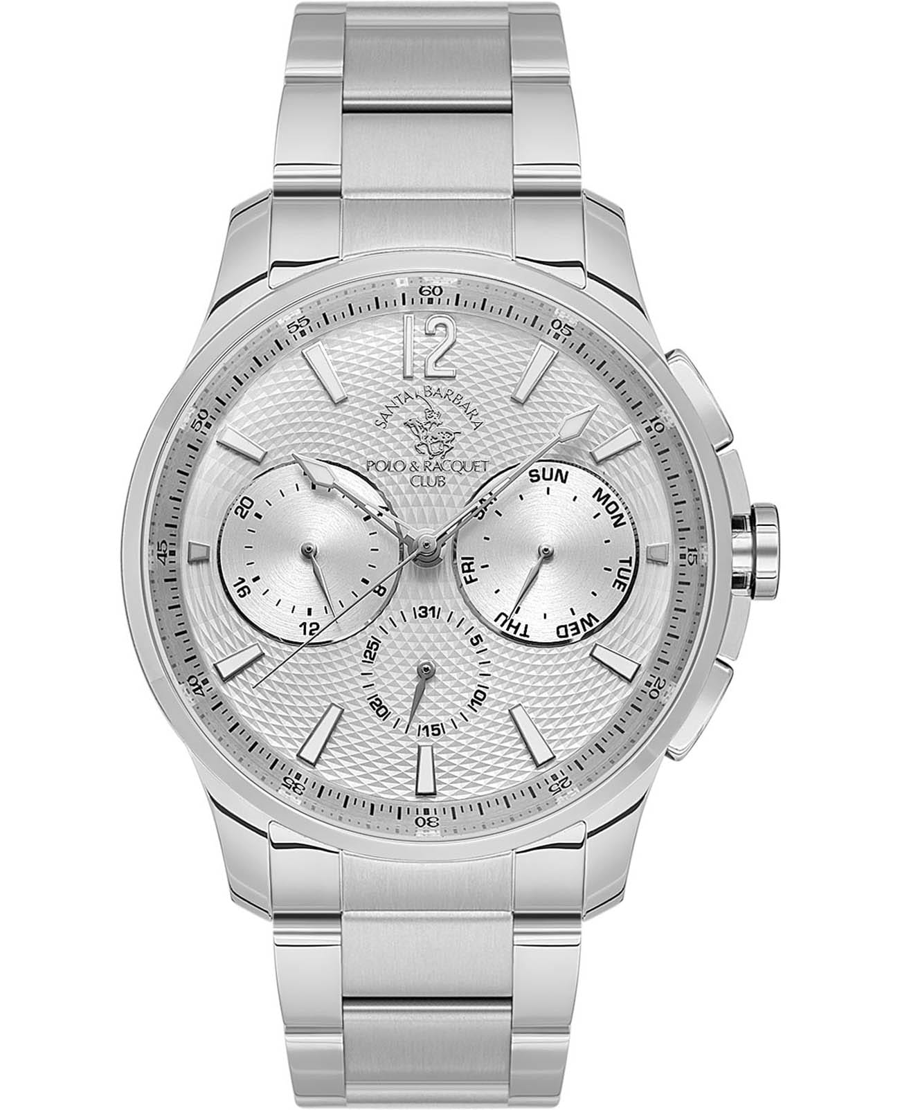Мужские кварцевые часы Santa Barbara Polo & Racquet Club — это идеальный выбор для тех, кто ценит практичность и стиль. Корпус диаметром 43 мм выполнен из нержавеющей стали 316L с матовой и полированной отделкой. Циферблат серебристого цвета с текстурной поверхностью украшен фирменным логотипом и накладными метками в виде штрихов. Указатели дня недели и даты вынесены на отдельные субциферблаты, также присутствует индикация 24-часового формата времени. Стрелки и метки с люминесцентным покрытиемЛюминесцентное покрытиеПозволяет считывать показания времени в темноте. Производители наносят на стрелки, часовые индексы, безель или поверхность циферблата светонакопительный состав, дающий холодное свечение., обеспечивающим хорошую читаемость в темноте. Циферблат защищён минеральным стекломМинеральное стеклоМинеральное стекло представляет собой искусственно выращенный минерал кварца. Такое стекло отличается особой устойчивостью к повреждениям и царапинам. Уступает по некоторым качествам сапфировому стеклу.. Часы оснащены стальным браслетом с застёжкой «бабочка» с кнопкамиЗастёжка "бабочка"Такой вид застёжки дополняется предохранителями, помогающими избежать случайного раскрытия браслета. Обладают изящным исполнением. . Водонепроницаемость 50 м позволяет использовать часы в повседневных условиях. Идеальный выбор для тех, кто ценит классический дизайн, точность и надёжность.