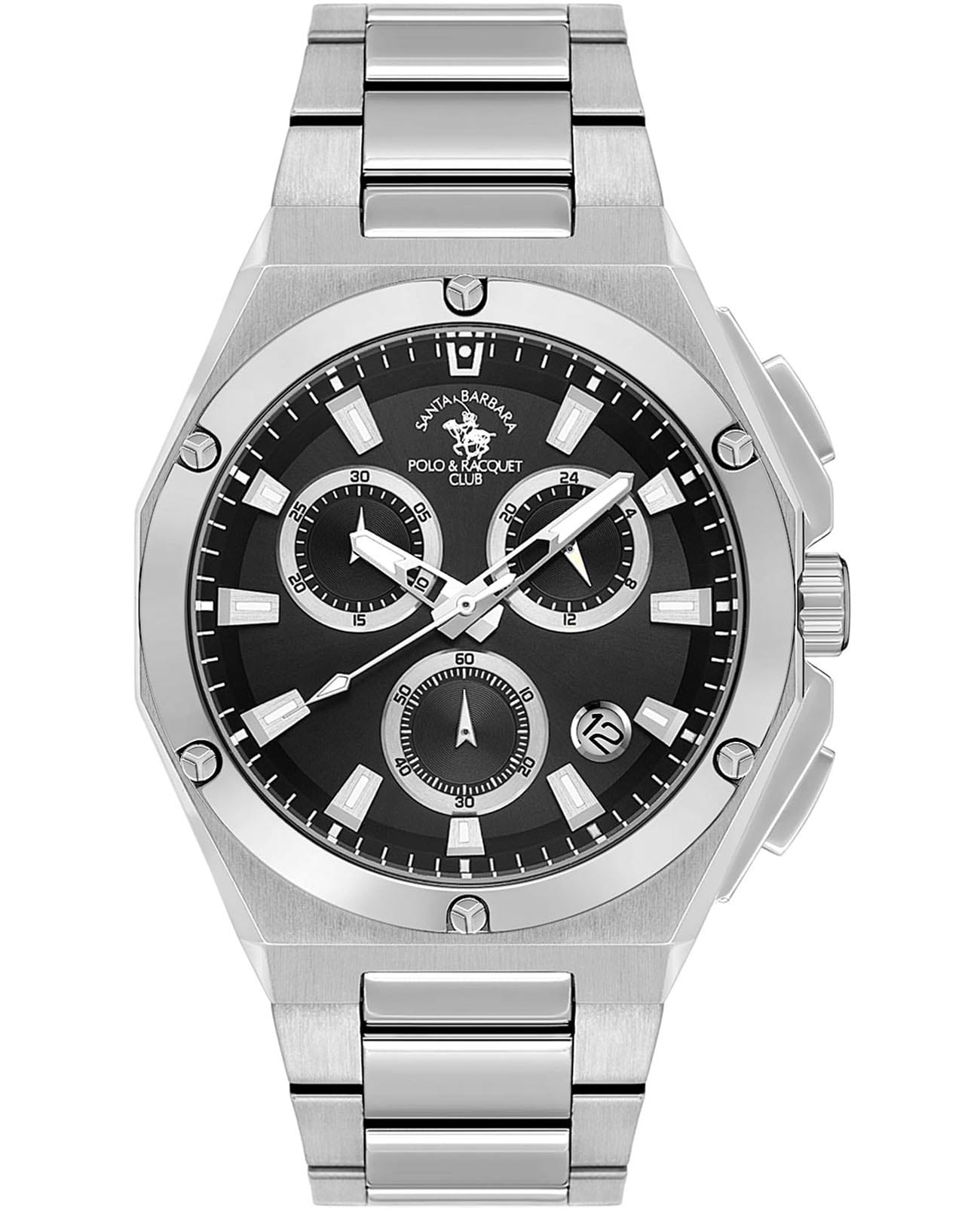 Santa Barbara Polo & Racquet Club Prive SB.1.10577-1 — стильные мужские часы-хронограф, сочетающие спортивную динамику и функциональность. Крупный корпус выполнен из нержавеющей стали 316L и гармонично дополнен браслетом на раскладной застёжкеРаскладная застёжкаТакой тип застёжки используется только на браслетах из металла. Она никогда не раскрывается полностью, происходит разделение на 2 и более частей. Раскладывающая застёжка снизит вероятность потери часов к минимуму.. Циферблат с акцентными метками и стрелками с люминесцентным покрытиемЛюминесцентное покрытиеПозволяет считывать показания времени в темноте. Производители наносят на стрелки, часовые индексы, безель или поверхность циферблата светонакопительный состав, дающий холодное свечение. оформлен в многослойной структуре и оснащён вспомогательными индикаторами, включая хронографХронографФункция позволяет измерять отрезки времени с особой точностью: часы, минуты, секунды. Верным признаком хронографа является наличие на циферблате 3 дополнительных окошек-счётчиков., 24-часовой формат времени. В нижней части расположено окошко даты, что делает модель ещё более практичной. Минеральное стеклоМинеральное стеклоМинеральное стекло представляет собой искусственно выращенный минерал кварца. Такое стекло отличается особой устойчивостью к повреждениям и царапинам. Уступает по некоторым качествам сапфировому стеклу. защищает циферблат от царапин, а кварцевый механизм обеспечивает высокую точность. Водонепроницаемость 50 метров позволит защитить корпус от случайных брызг или капель дождя. Благодаря своей универсальной эстетике эти часы уместны и в деловой среде, и в повседневном образе.
