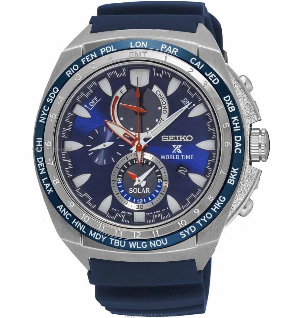 Сине-серебристая модель дополнена силиконовым ремешком, обеспечивающим комфортное ношение. Работу часов обеспечивает японский кварцевый механизм V195, реализуется питание по технологии . Опции: секундомер, мировое времяМировое время Полезное часовое усложнение, отображающее время в основных городах и известных областях по всему миру, оно связано с часовыми поясами, удобно для путешественников и бизнесменов. , календарь, хронографХронографФункция позволяет измерять отрезки времени с особой точностью: часы, минуты, секунды. Верным признаком хронографа является наличие на циферблате 3 дополнительных окошек-счётчиков.. На стрелки и метки нанесено люминесцентное покрытиеЛюминесцентное покрытиеПозволяет считывать показания времени в темноте. Производители наносят на стрелки, часовые индексы, безель или поверхность циферблата светонакопительный состав, дающий холодное свечение.. Минеральное стекло Hardlex устойчиво к царапинам.