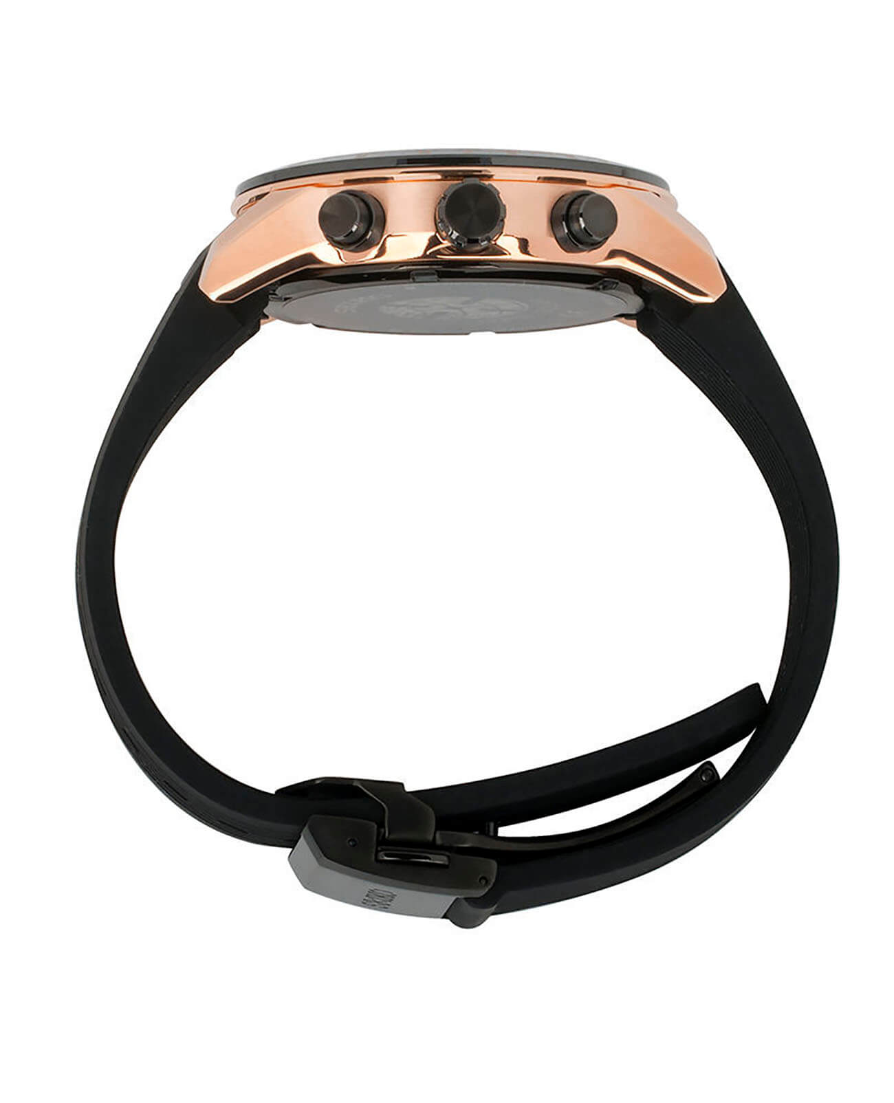 . Сапфировое стекло. Водонепроницаемость до 100 метров. Люминесцентная подсветкаЛюминесцентное покрытиеПозволяет считывать показания времени в темноте. Производители наносят на стрелки, часовые индексы, безель или поверхность циферблата светонакопительный состав, дающий холодное свечение.. Силиконовый ремешок. Секундомер, календарь до 2100 года, мировое времяМировое время Полезное часовое усложнение, отображающее время в основных городах и известных областях по всему миру, оно связано с часовыми поясами, удобно для путешественников и бизнесменов. . Диаметр корпуса: 43 мм.