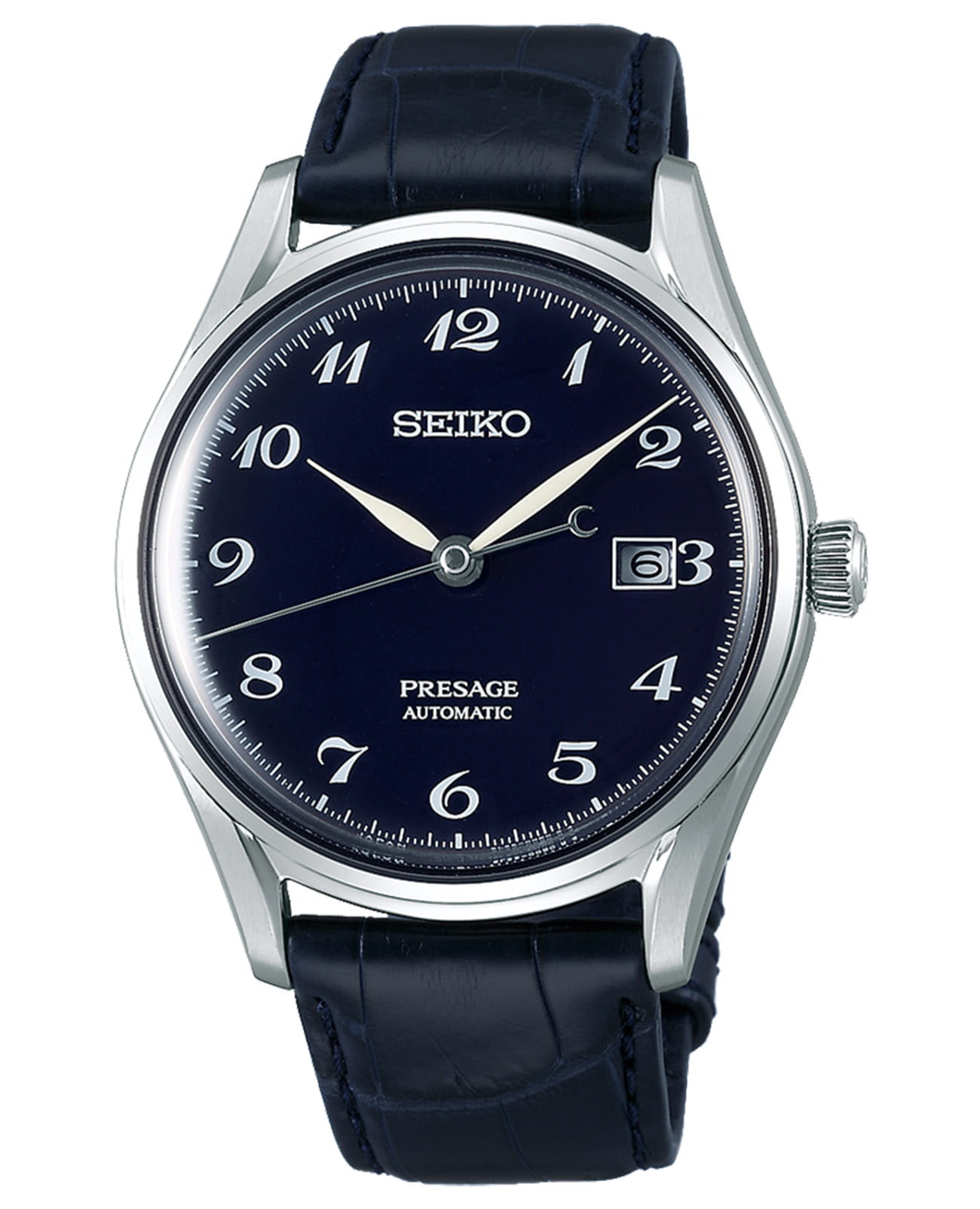 Мужские японские механические часы Seiko Presage SJE077J1, механический механизм (автоматический калибр) с высокой точностью. Сапфировое стеклоСапфировое стеклоПрочный и надёжный материал из кристалла сапфира синтетического происхождения, характеризующийся особой твёрдостью и устойчивостью к царапинам и повреждениям. устойчивое к появлению царапин, обладающее высокой прозрачностью. Антибликовое покрытиеАнтибликовое покрытиеСлой оксида металла в 0,13-0,3 микрон, благодаря которому стекло часов не бликует и не отражает свет. Антибликовое покрытие уменьшает отражение света в 10 раз, обеспечивая отличную читаемость показателей циферблата. нанесено на внутреннюю поверхность стекла. Класс водозащиты: 100 метров, позволит плавать, нырять и заниматься другими водными видами спорта. Корпус часов изготовлен из стали. В часах установлен автоматический калибр 6L35, в механизме 26 камней. Запас хода до 45 часов. На циферблате арабская индикация времени и окошко даты в позиции 3 часов. Особенностью модели являются эмалевый циферблат, который вручную в Японии был изготовлен опытным эмалевым художником путем обжига при высокой температуре, и прозрачная, завинчивающаяся задняя крышка.