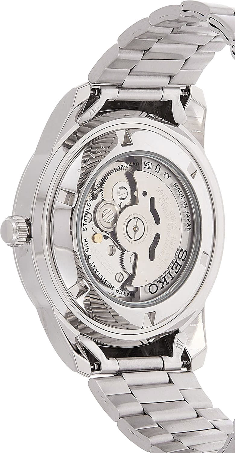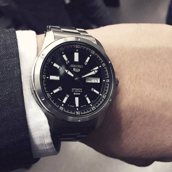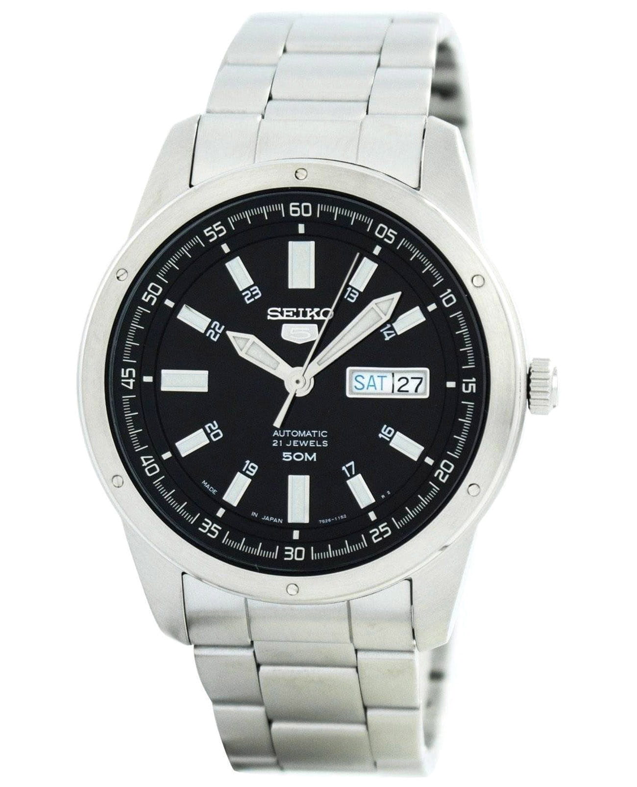 Мужские японские часы с запасом хода 41 час Seiko 5 Regular SNKN13J1 с минеральным стекломМинеральное стеклоМинеральное стекло представляет собой искусственно выращенный минерал кварца. Такое стекло отличается особой устойчивостью к повреждениям и царапинам. Уступает по некоторым качествам сапфировому стеклу., механический механизм (автоматический калибр) с высокой точностью. Класс водозащиты: 50 метров, позволит защитить корпус от случайных брызг или капель дождя. Корпус и браслет часов изготовлен из стали. Браслет на раскладной застёжкеРаскладная застёжкаТакой тип застёжки используется только на браслетах из металла. Она никогда не раскрывается полностью, происходит разделение на 2 и более частей. Раскладывающая застёжка снизит вероятность потери часов к минимуму. с кнопками. Окошко даты и дня недели находятся в положении 3 часа. Стрелки и метки с люминесцентным покрытиемЛюминесцентное покрытиеПозволяет считывать показания времени в темноте. Производители наносят на стрелки, часовые индексы, безель или поверхность циферблата светонакопительный состав, дающий холодное свечение..