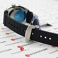Аксессуар из специальной серии отличается оригинальным дизайном. Чёрный циферблат с узором дополнен метками и стрелками с люминесцентной подсветкойЛюминесцентное покрытиеПозволяет считывать показания времени в темноте. Производители наносят на стрелки, часовые индексы, безель или поверхность циферблата светонакопительный состав, дающий холодное свечение.. Японский автоматический калибр Seiko 4К36 имеет запас хода на 41 час. Корпус выполнен из стали 316L с PVD-покрытиемPVDУльтратонкое покрытие наносится в технике вакуумного напыления, сочетает в себе нитрид титана особой прочности со слоем золота или оксида хрома. Несёт в себе декоративную или защитную функцию.. Рифленая заводная головка защищена, безельБезельВнешний ободок, закрепляющий стекло. В спортивных часах так называется поворотное кольцо с делениями на циферблате, выполняет роль таймера – замеряет отрезки времени на шкале. Неподвижный безель – элемент декора. Однонаправленно вращающийся безель на дайверских часах позволяет фиксировать моменты погружения и выныривания на поверхность. вращается в одном направлении. Индикатор даты отображает число и день недели.