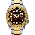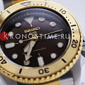 Часы Seiko 5 Sports SRPK24 сочетают в себе элегантный дизайн и надёжность, характерные для японского часового мастерства. Корпус диаметром 42,5 мм выполнен из нержавеющей стали с двухцветным PVD-покрытиемPVDУльтратонкое покрытие наносится в технике вакуумного напыления, сочетает в себе нитрид титана особой прочности со слоем золота или оксида хрома. Несёт в себе декоративную или защитную функцию.: сочетание серебристого и золотистого тонов придаёт часам утончённый вид. Коричневый циферблат защищён минеральным стекломМинеральное стеклоМинеральное стекло представляет собой искусственно выращенный минерал кварца. Такое стекло отличается особой устойчивостью к повреждениям и царапинам. Уступает по некоторым качествам сапфировому стеклу. с повышенной прочностью.
