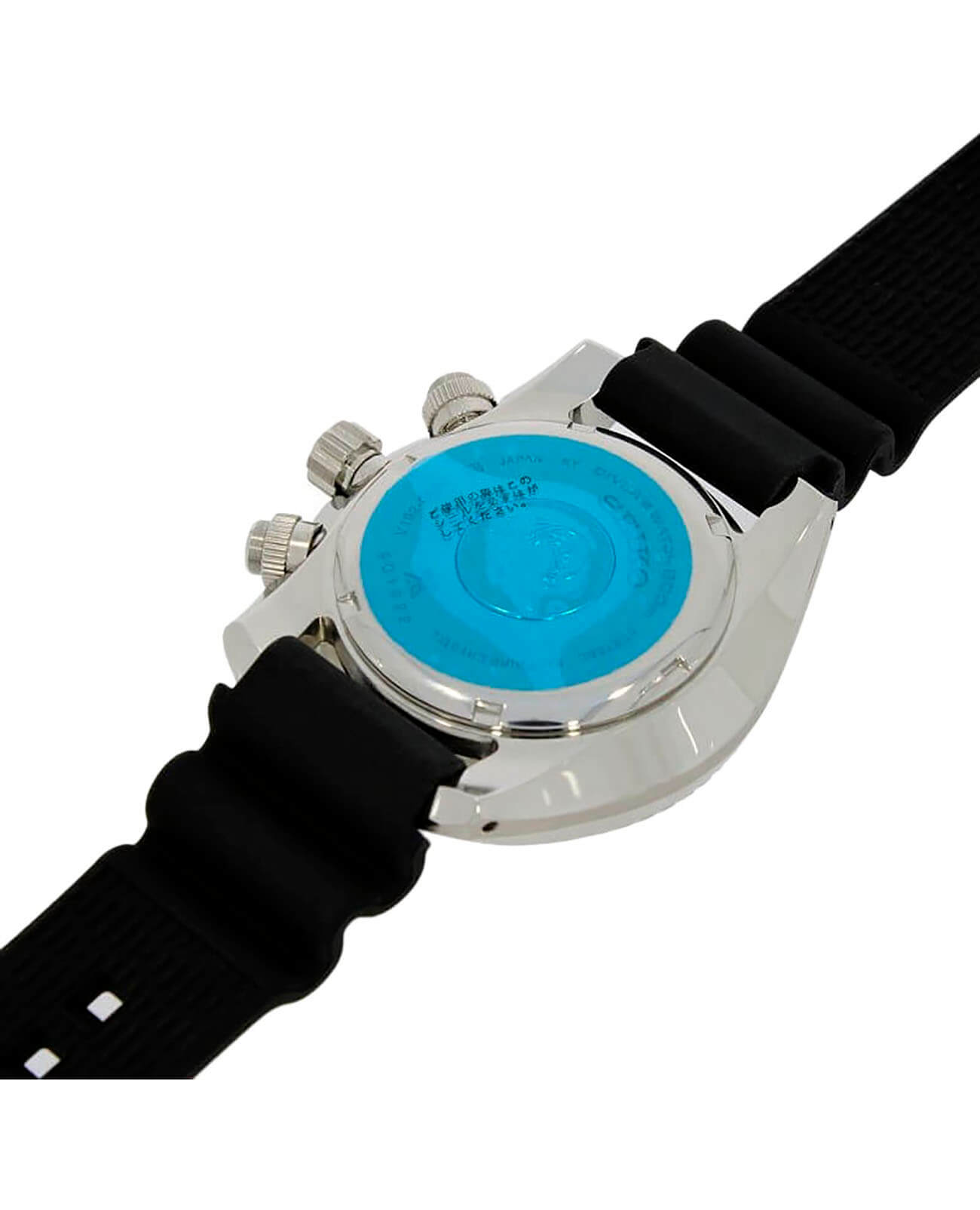 Аксессуар привлекает сдержанным серебристо-синим исполнением в дайверской тематике. Этому способствуют однонаправленно вращающийся безель, заводная головка с защитой, завинчивающаяся задняя крышка, крупная индикация времени. Кварцевый хронографХронографФункция позволяет измерять отрезки времени с особой точностью: часы, минуты, секунды. Верным признаком хронографа является наличие на циферблате 3 дополнительных окошек-счётчиков. получает питание от источников света, реализуется технология . Полностью заряженной батарейки хватит на 6 месяцев работы. Японский механизм Seiko V192 отличается высокой точностью хода. Стрелки и метки дополнены люминесцентной подсветкой LumiBriteЛюминесцентное покрытиеПозволяет считывать показания времени в темноте. Производители наносят на стрелки, часовые индексы, безель или поверхность циферблата светонакопительный состав, дающий холодное свечение..Сапфировое стекло не допускает образования царапин. Часы оснащены секундомером, календарём, индикатором EOLEOLПредставляет собой систему, уведомляющую владельца часов о необходимости замены элемента питания. За 2 недели до полного разряда батарейки секундная стрелка перестаёт ходить чётко и начинает перепрыгивать на 3-4 деления.. Гибкий ремешок сделан из силикона. Диаметр корпуса: 44,5 мм.