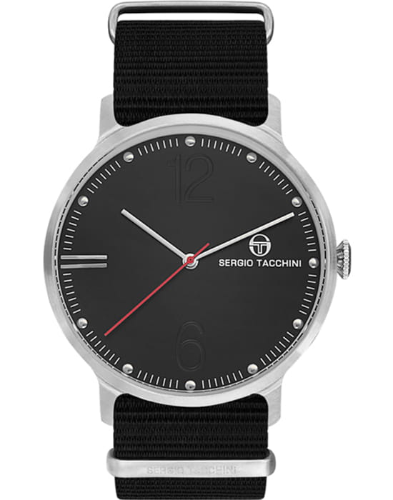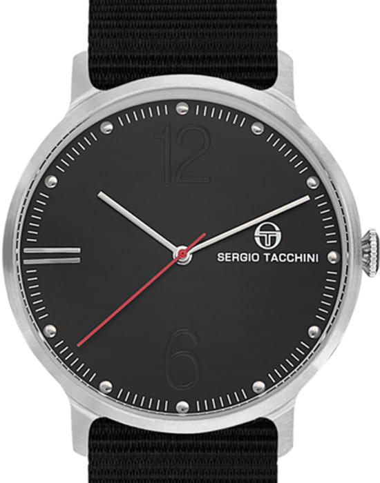 Sergio Tacchini — стильные мужские часы в минималистичном дизайне, подчеркивающем лёгкость и современность образа. Круглый корпус выполнен из нержавеющей стали, а циферблат оформлен крупными арабскими цифрами «6» и «12» и тонкими метками, что делает показания лёгкими для восприятия.