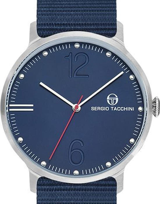 Sergio Tacchini — стильные мужские часы в минималистичном дизайне, подчеркивающем лёгкость и современность образа. Круглый корпус выполнен из нержавеющей стали, а циферблат оформлен крупными арабскими цифрами «6» и «12» и тонкими метками, что делает показания лёгкими для восприятия.