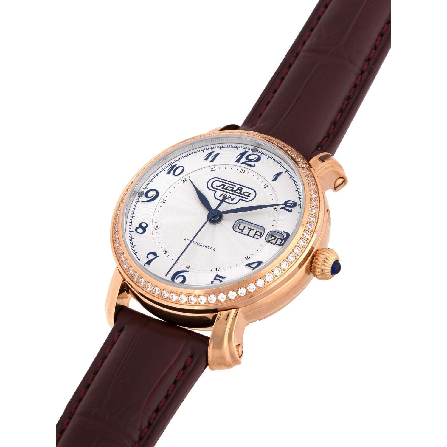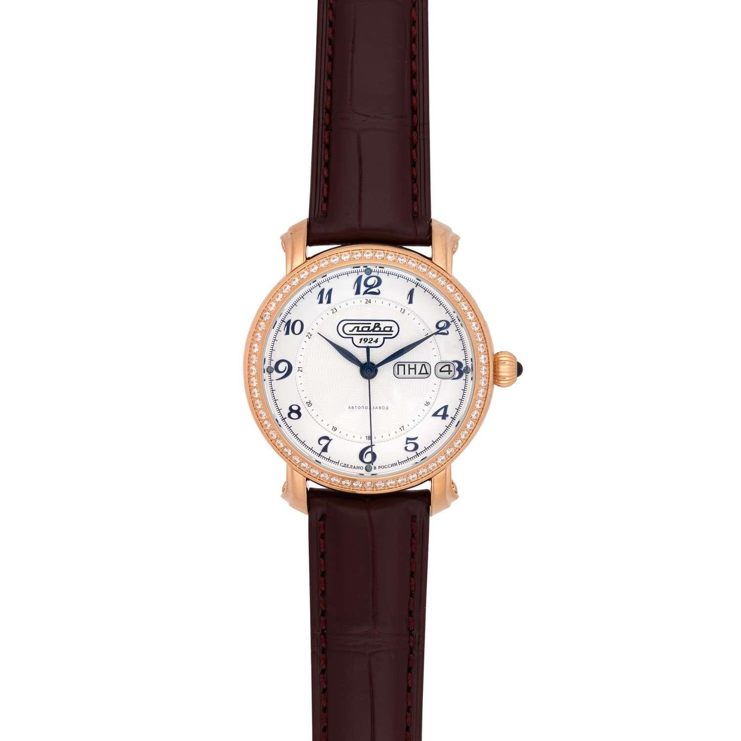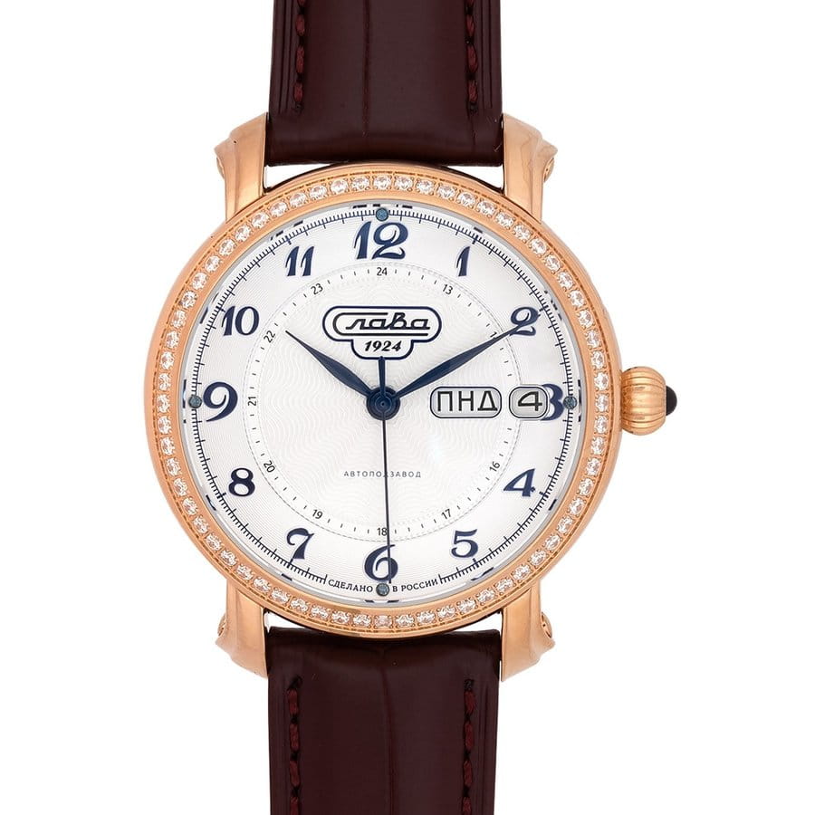 Наручные часы Слава Слава России 7443615/300-2427-68 — воплощение классического стиля и исключительного качества, произведенные в России. Эта модель из лимитированной коллекции станет великолепным дополнением к вашему образу. Часы оснащены надежным механическим механизмом "Слава 2427" с автоподзаводом, обеспечивающим точный ход и оснащены двойным календарем, что позволяет всегда быть в курсе текущей даты. Корпус из нержавеющей стали с золотистым PVDPVDУльтратонкое покрытие наносится в технике вакуумного напыления, сочетает в себе нитрид титана особой прочности со слоем золота или оксида хрома. Несёт в себе декоративную или защитную функцию.-покрытием диаметром 41 мм и толщиной 14,2 мм отличается высокой прочностью и водозащитой до 5 ATM.  БезельБезельВнешний ободок, закрепляющий стекло. В спортивных часах так называется поворотное кольцо с делениями на циферблате, выполняет роль таймера – замеряет отрезки времени на шкале. Неподвижный безель – элемент декора. Однонаправленно вращающийся безель на дайверских часах позволяет фиксировать моменты погружения и выныривания на поверхность. часов с вставками из камней циркона. Серебристый циферблат с арабскими цифрами защищен сапфировым стекломСапфировое стеклоПрочный и надёжный материал из кристалла сапфира синтетического происхождения, характеризующийся особой твёрдостью и устойчивостью к царапинам и повреждениям., устойчивым к царапинам, что позволяет надолго сохранить безупречный вид часов. На 3 часах расположено окошко с указателем даты и дня недели. Кожаный ремень из крокодила с застежкой «бабочка»Застёжка "бабочка"Такой вид застёжки дополняется предохранителями, помогающими избежать случайного раскрытия браслета. Обладают изящным исполнением. добавляет элегантности и комфорта, создавая ощущение роскоши и изысканности. Эта модель станет идеальным выбором для тех, кто ценит традиции и высокое качество в сочетании с современным дизайном.