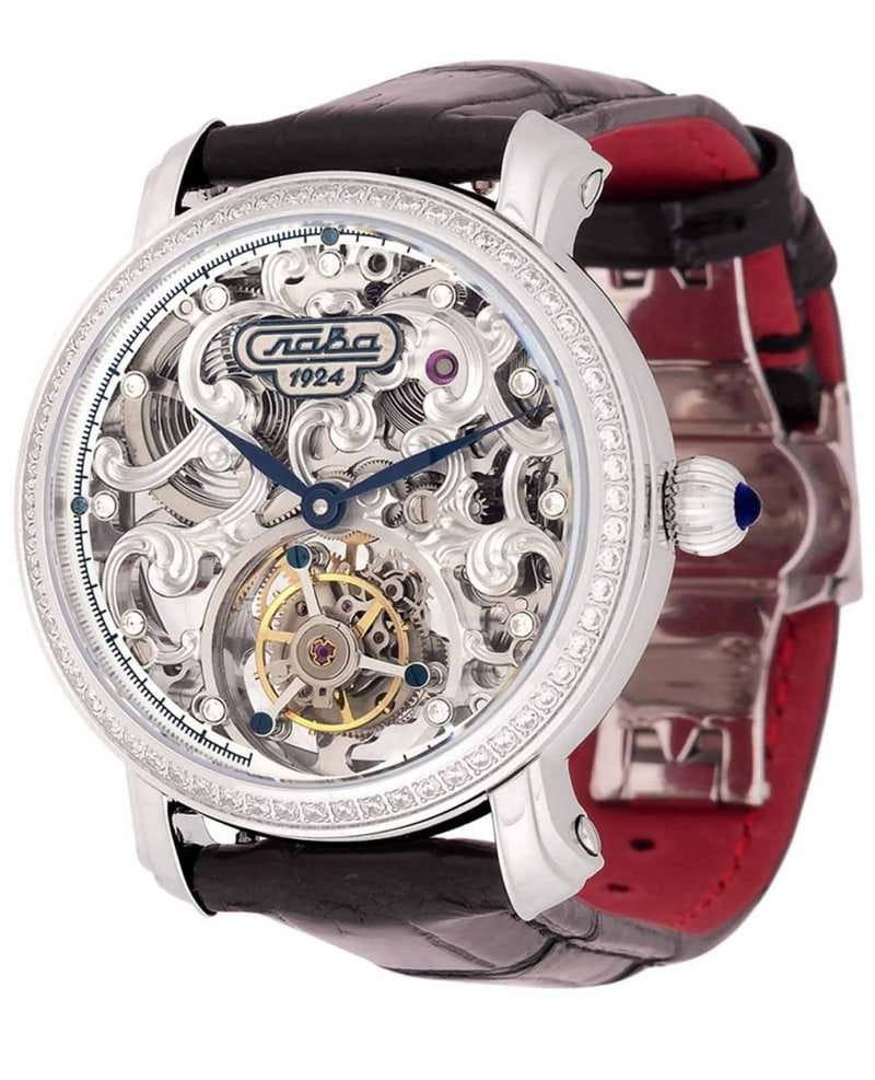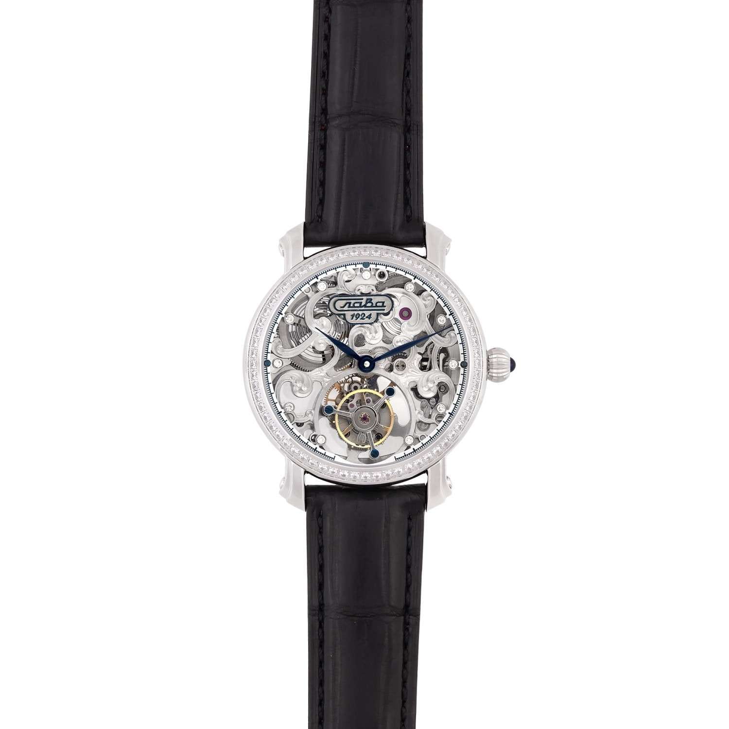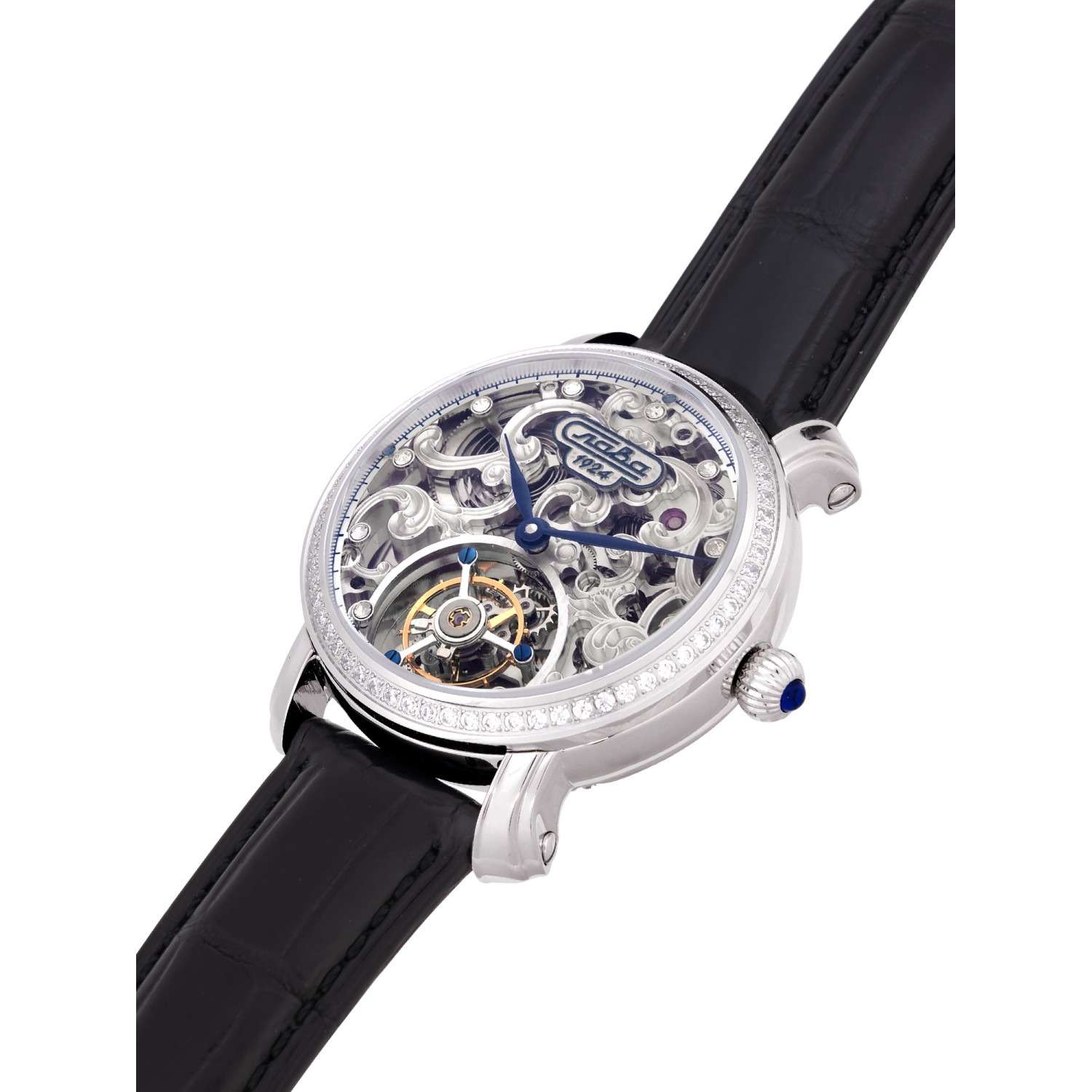 Наручные часы Слава Слава России 7460619/300-3451С-68 — воплощение классического стиля и исключительного качества, произведенные в России. Эта модель из лимитированной коллекции станет великолепным дополнением к вашему образу. Часы оснащены надежным механическим механизмом Hangzhou SL3451 с автоподзаводом, обеспечивающим точный ход и оснащены скелетоном, позволяющим любоваться механизмом. Корпус из нержавеющей стали с родиевым покрытием диаметром 41 мм и толщиной 14,2 мм отличается высокой прочностью и водозащитой до 5 ATM. БезельБезельВнешний ободок, закрепляющий стекло. В спортивных часах так называется поворотное кольцо с делениями на циферблате, выполняет роль таймера – замеряет отрезки времени на шкале. Неподвижный безель – элемент декора. Однонаправленно вращающийся безель на дайверских часах позволяет фиксировать моменты погружения и выныривания на поверхность. часов с вставками из камней циркона. Серебристый циферблат с открытым механизмом защищен сапфировым стекломСапфировое стеклоПрочный и надёжный материал из кристалла сапфира синтетического происхождения, характеризующийся особой твёрдостью и устойчивостью к царапинам и повреждениям., устойчивым к царапинам, что позволяет надолго сохранить безупречный вид часов. Кожаный ремень из крокодила с застежкой «бабочка»Застёжка "бабочка"Такой вид застёжки дополняется предохранителями, помогающими избежать случайного раскрытия браслета. Обладают изящным исполнением. добавляет элегантности и комфорта, создавая ощущение роскоши и изысканности. Эта модель станет идеальным выбором для тех, кто ценит традиции и высокое качество в сочетании с современным дизайном.
