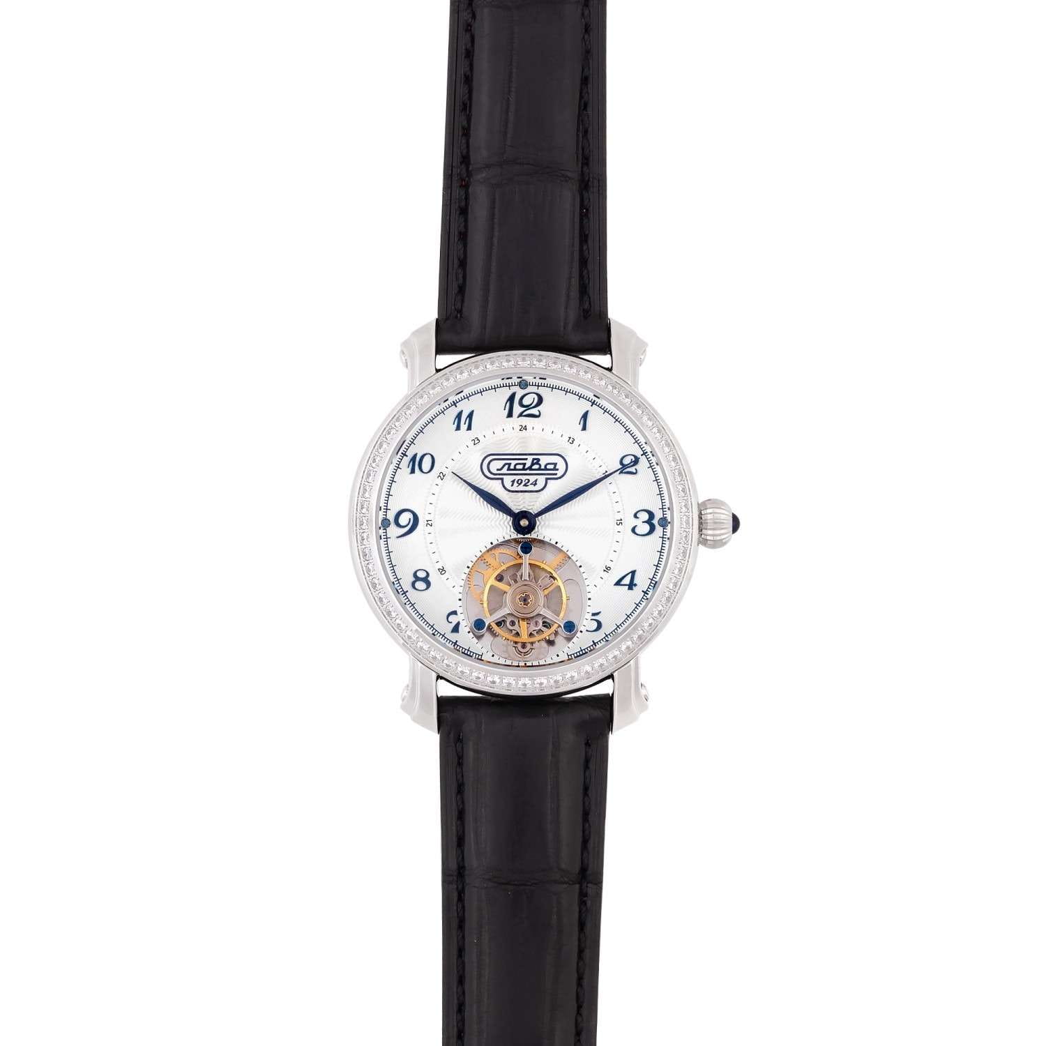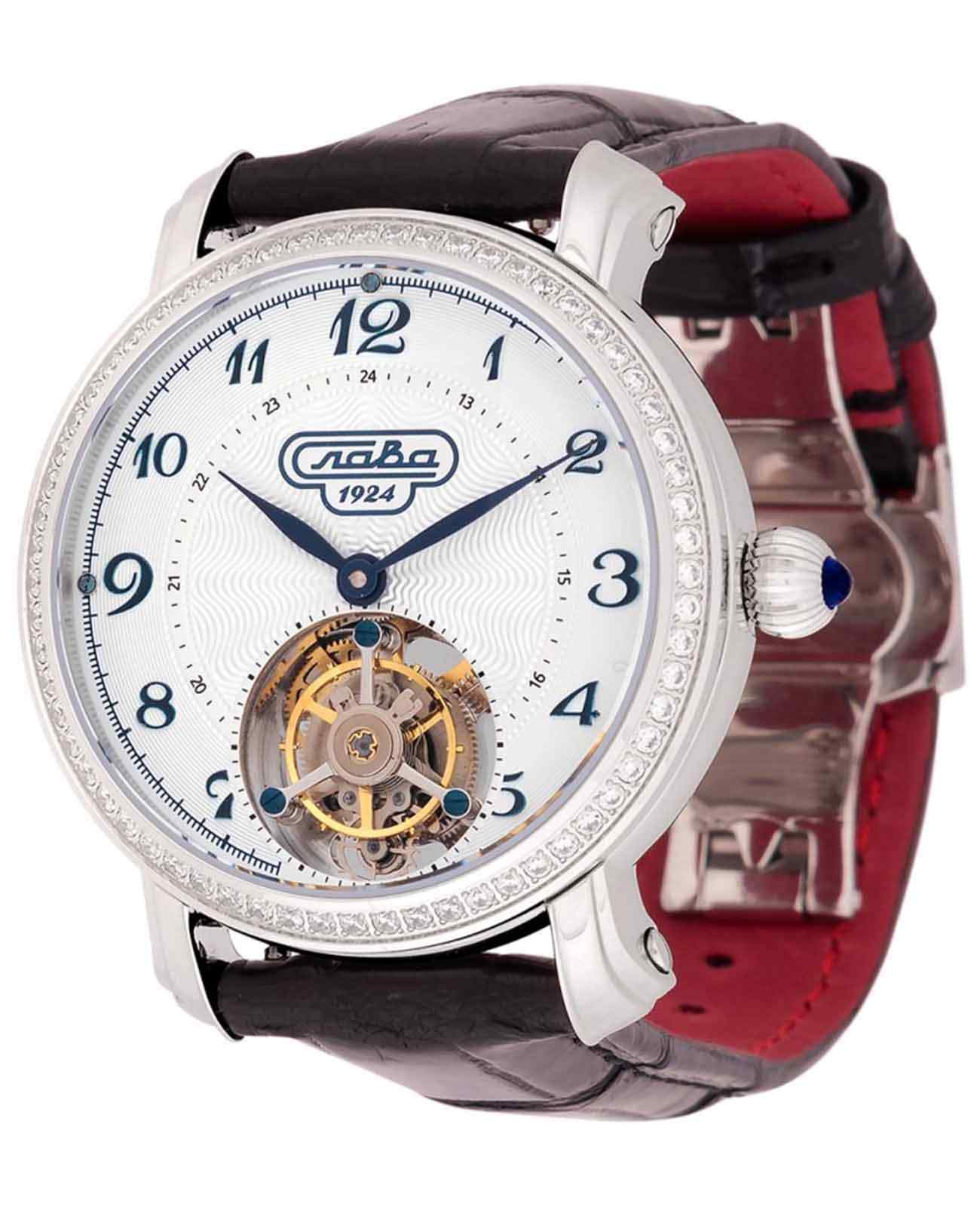Наручные часы Слава Слава России 7460620/300-3400-68 — воплощение классического стиля и исключительного качества, произведенные в России. Эта модель из лимитированной коллекции станет великолепным дополнением к вашему образу. Часы оснащены надежным механическим механизмом Hangzhou SL3400 с автоподзаводом, обеспечивающим точный ход и оснащены турбийоном. Корпус из нержавеющей стали с родиевым покрытием диаметром 41 мм и толщиной 14,2 мм отличается высокой прочностью и водозащитой до 5 ATM. БезельБезельВнешний ободок, закрепляющий стекло. В спортивных часах так называется поворотное кольцо с делениями на циферблате, выполняет роль таймера – замеряет отрезки времени на шкале. Неподвижный безель – элемент декора. Однонаправленно вращающийся безель на дайверских часах позволяет фиксировать моменты погружения и выныривания на поверхность. часов с вставками из камней циркона. Серебристый циферблат с открытым механизмом и арабскими цифрами защищен сапфировым стекломСапфировое стеклоПрочный и надёжный материал из кристалла сапфира синтетического происхождения, характеризующийся особой твёрдостью и устойчивостью к царапинам и повреждениям., устойчивым к царапинам, что позволяет надолго сохранить безупречный вид часов. Кожаный ремень из крокодила с застежкой «бабочка»Застёжка "бабочка"Такой вид застёжки дополняется предохранителями, помогающими избежать случайного раскрытия браслета. Обладают изящным исполнением. добавляет элегантности и комфорта, создавая ощущение роскоши и изысканности. Эта модель станет идеальным выбором для тех, кто ценит традиции и высокое качество в сочетании с современным дизайном.