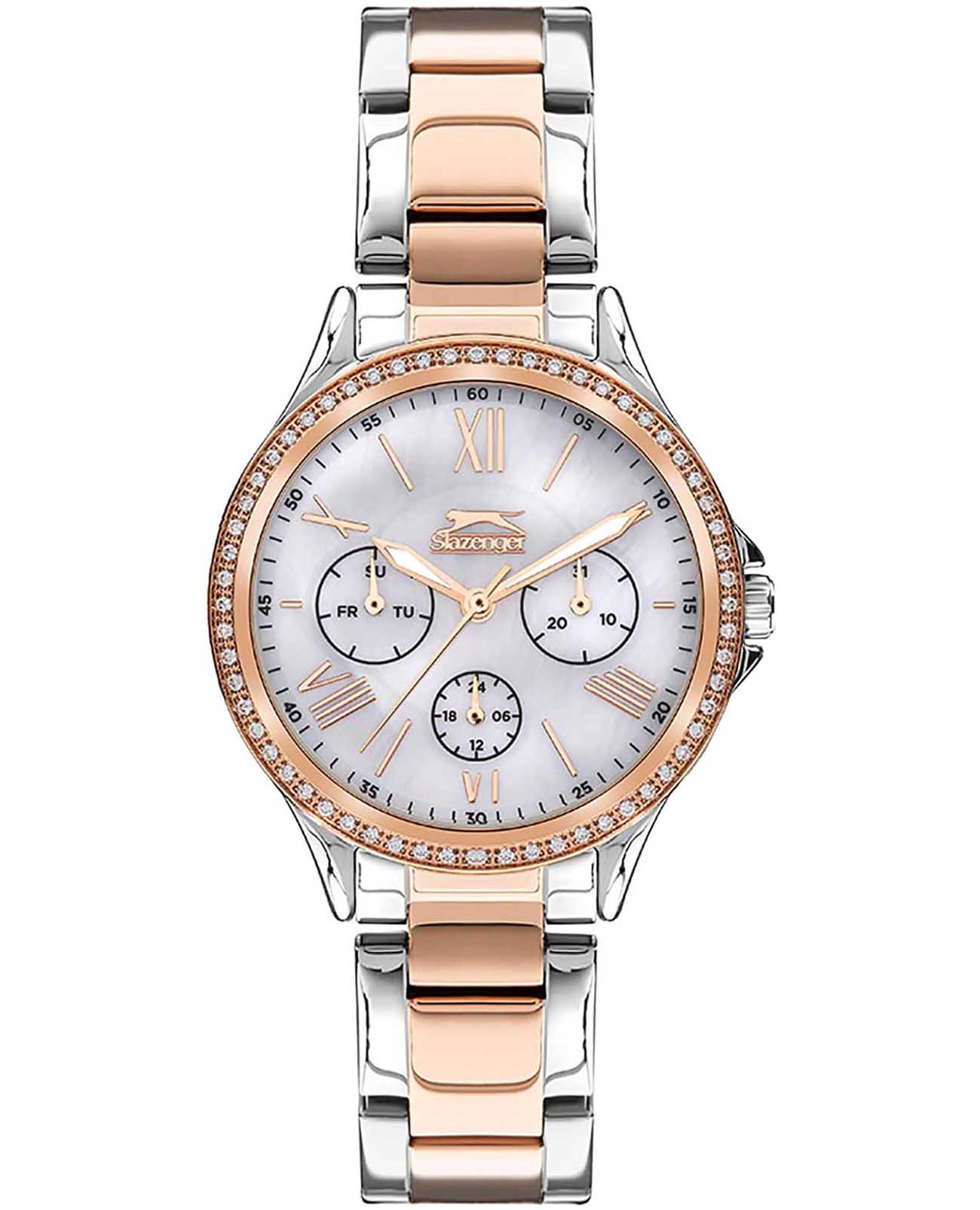Slazenger SL.09.2021.4.03 – элегантные женские часы, сочетающие стильный дизайн и функциональность. Корпус выполнен из суперметалла, придающим модели роскошный внешний вид. Перламутровый циферблат добавляет изысканности, и защищён минеральным стекломМинеральное стеклоМинеральное стекло представляет собой искусственно выращенный минерал кварца. Такое стекло отличается особой устойчивостью к повреждениям и царапинам. Уступает по некоторым качествам сапфировому стеклу., устойчивым к царапинам. БезельБезельВнешний ободок, закрепляющий стекло. В спортивных часах так называется поворотное кольцо с делениями на циферблате, выполняет роль таймера – замеряет отрезки времени на шкале. Неподвижный безель – элемент декора. Однонаправленно вращающийся безель на дайверских часах позволяет фиксировать моменты погружения и выныривания на поверхность. с PVD-покрытиемPVDУльтратонкое покрытие наносится в технике вакуумного напыления, сочетает в себе нитрид титана особой прочности со слоем золота или оксида хрома. Несёт в себе декоративную или защитную функцию. украшен кристаллами. Часы оснащены точным кварцевым механизмом, обеспечивающим надёжное и стабильное отображение времени. Дополнительные функции включают индикацию дня недели и даты, что повышает практичность использования. Браслет из суперметалла с PVD-покрытиемPVDУльтратонкое покрытие наносится в технике вакуумного напыления, сочетает в себе нитрид титана особой прочности со слоем золота или оксида хрома. Несёт в себе декоративную или защитную функцию. оснащён раскладной застёжкойРаскладная застёжкаТакой тип застёжки используется только на браслетах из металла. Она никогда не раскрывается полностью, происходит разделение на 2 и более частей. Раскладывающая застёжка снизит вероятность потери часов к минимуму., обеспечивающей комфортное ношение и надёжную фиксацию на запястье. Водозащита до 30 метров (3 ATM) защищает часы от случайных брызг и дождя, делая их подходящими для повседневного использования.