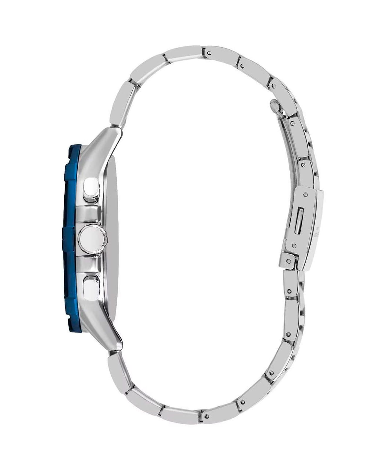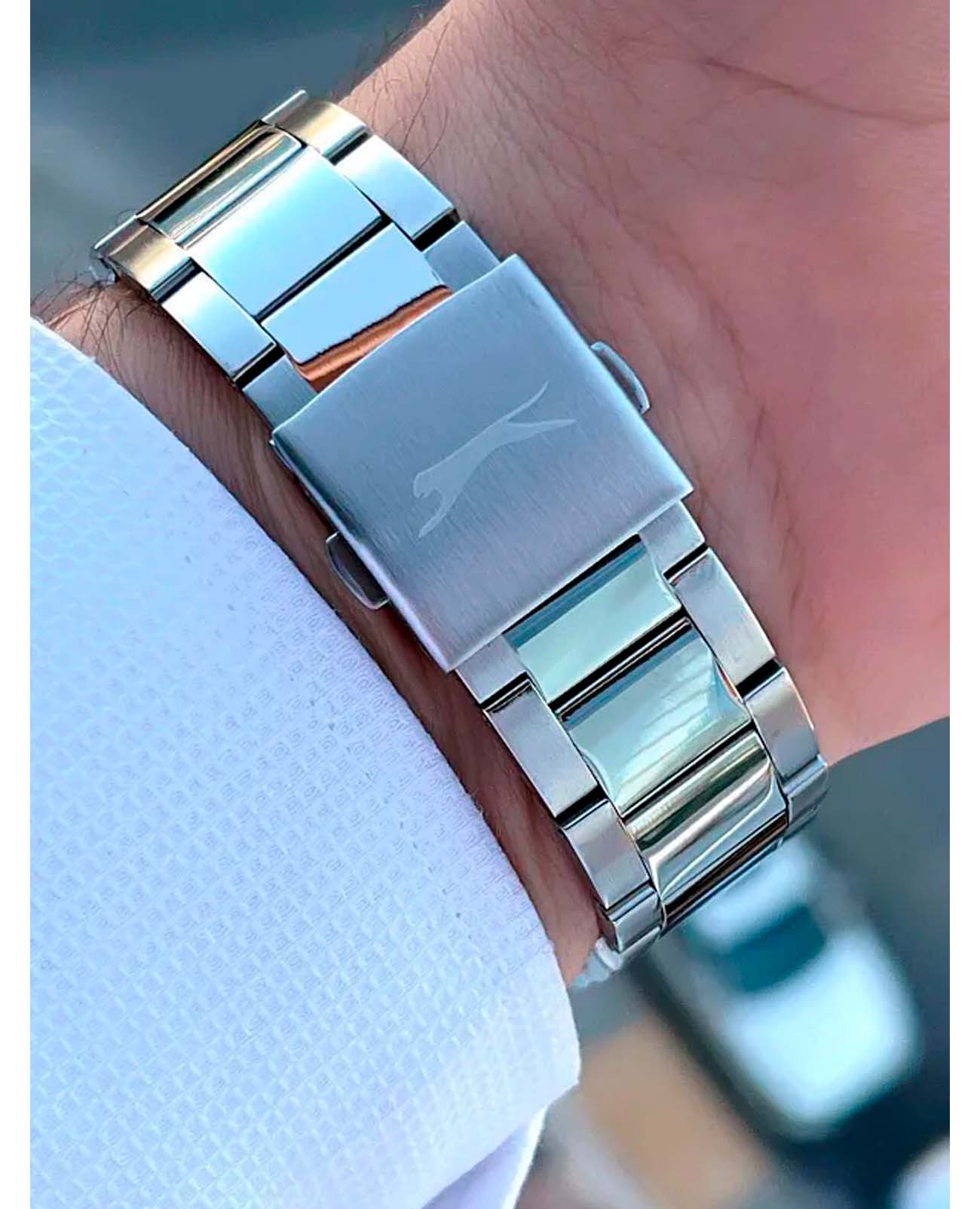 Мужские наручные часы Slazenger SL.09.2035.2.02 сочетают в себе классический дизайн и надежность современных технологий. Модель обладает круглым корпусом диаметром 46 мм, изготовленным из материала supermetal с серебряным покрытием, что обеспечивает высокую устойчивость к внешним воздействиям. БезельБезельВнешний ободок, закрепляющий стекло. В спортивных часах так называется поворотное кольцо с делениями на циферблате, выполняет роль таймера – замеряет отрезки времени на шкале. Неподвижный безель – элемент декора. Однонаправленно вращающийся безель на дайверских часах позволяет фиксировать моменты погружения и выныривания на поверхность. с IP-покрытиемIP-покрытиеМетод ионного напыления. Демонстрирует повышенную устойчивость к истиранию, окислению и химическим веществам. Под воздействием высокого давления и температуры около 1500°C молекулы металла надёжно соединяются с частицами корпуса часов.. Браслет выполнен из суперметалла с раскладной застежкойРаскладной замокДанный вариант застежки используется только на часах с металлическим браслетом. Отличительная особенность такого крепления в том, что длина браслета становится универсальной и вы можете самостоятельно отрегулировать нужный вам размер – застежка просто двигается по браслету часов., гарантирующей комфортное ношение и безопасность.
