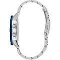 Циферблат синего цвета декорирован стрелками, обеспечивающими четкую читаемость времени. Для защиты используется минеральное стеклоМинеральное стеклоМинеральное стекло представляет собой искусственно выращенный минерал кварца. Такое стекло отличается особой устойчивостью к повреждениям и царапинам. Уступает по некоторым качествам сапфировому стеклу., обеспечивающее прочную защиту от царапин.