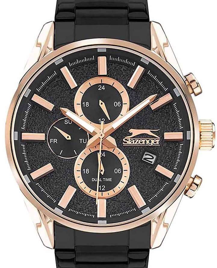 Часы Slazenger SL.09.2059.2.03 представляют собой стильное и функциональное дополнение к вашему образу. Их черный циферблат и корпус с безелемБезельВнешний ободок, закрепляющий стекло. В спортивных часах так называется поворотное кольцо с делениями на циферблате, выполняет роль таймера – замеряет отрезки времени на шкале. Неподвижный безель – элемент декора. Однонаправленно вращающийся безель на дайверских часах позволяет фиксировать моменты погружения и выныривания на поверхность. из суперметалла с IP-покрытиемIP-покрытиеМетод ионного напыления. Демонстрирует повышенную устойчивость к истиранию, окислению и химическим веществам. Под воздействием высокого давления и температуры около 1500°C молекулы металла надёжно соединяются с частицами корпуса часов. создают элегантный и современный вид, который подчеркнет вашу индивидуальность. Эти мужские часы оснащены кварцевым механизмом, обеспечивающим точность хода. Минеральное стеклоМинеральное стеклоМинеральное стекло представляет собой искусственно выращенный минерал кварца. Такое стекло отличается особой устойчивостью к повреждениям и царапинам. Уступает по некоторым качествам сапфировому стеклу. защищает циферблат от царапин, а люминесцентное покрытиеЛюминесцентное покрытиеПозволяет считывать показания времени в темноте. Производители наносят на стрелки, часовые индексы, безель или поверхность циферблата светонакопительный состав, дающий холодное свечение. на стрелках позволяет легко считывать время даже в темноте. Функциональность часов дополнена вторым часовым поясомВторой часовой поясФункция, позволяющая отображать время двух часовых поясов одновременно., 24-часовым указателем времени, календарем даты в районе 4 часа и дня недели. Черный браслет из суперметалла с IP-покрытиемIP-покрытиеМетод ионного напыления. Демонстрирует повышенную устойчивость к истиранию, окислению и химическим веществам. Под воздействием высокого давления и температуры около 1500°C молекулы металла надёжно соединяются с частицами корпуса часов. и с раскладной застёжкойРаскладная застёжкаТакой тип застёжки используется только на браслетах из металла. Она никогда не раскрывается полностью, происходит разделение на 2 и более частей. Раскладывающая застёжка снизит вероятность потери часов к минимуму. гармонично дополняет общий дизайн. Размер корпуса составляет 44 мм в диаметре и 12 мм в толщину, что делает их удобными для повседневного ношения. А водозащита уровня 5 ATM делает их надежными спутниками даже в условиях повышенной влажности.
