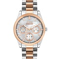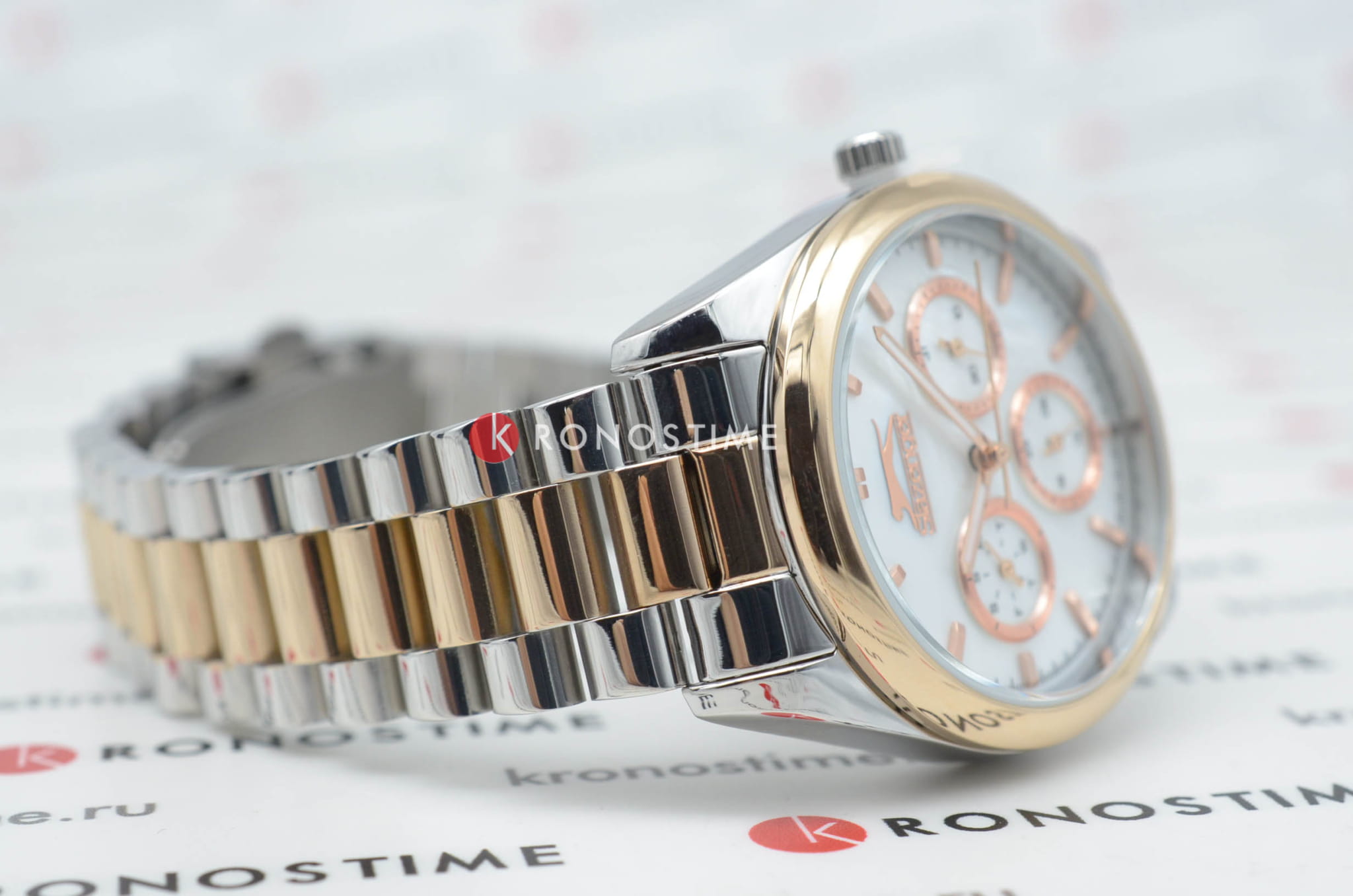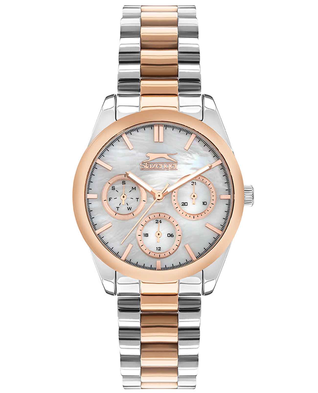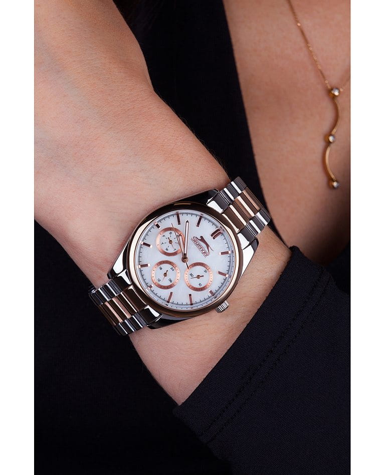 Женские наручные часы Slazenger SL.09.2063.4.04 сочетают в себе классический дизайн и высокое качество исполнения. Модель обладает круглым корпусом диаметром 36 мм, изготовленным из суперметалла, что обеспечивает устойчивость к внешним воздействиям. Браслет выполнен из суперметалла с частичным IP-покрытиемIP-покрытиеМетод ионного напыления. Демонстрирует повышенную устойчивость к истиранию, окислению и химическим веществам. Под воздействием высокого давления и температуры около 1500°C молекулы металла надёжно соединяются с частицами корпуса часов. на раскладной застёжкеРаскладная застёжкаТакой тип застёжки используется только на браслетах из металла. Она никогда не раскрывается полностью, происходит разделение на 2 и более частей. Раскладывающая застёжка снизит вероятность потери часов к минимуму.. Неподвижный безельБезельВнешний ободок, закрепляющий стекло. В спортивных часах так называется поворотное кольцо с делениями на циферблате, выполняет роль таймера – замеряет отрезки времени на шкале. Неподвижный безель – элемент декора. Однонаправленно вращающийся безель на дайверских часах позволяет фиксировать моменты погружения и выныривания на поверхность. из суперметалла с IP-покрытиемIP-покрытиеМетод ионного напыления. Демонстрирует повышенную устойчивость к истиранию, окислению и химическим веществам. Под воздействием высокого давления и температуры около 1500°C молекулы металла надёжно соединяются с частицами корпуса часов. цвета розового золота. Перламутровый циферблат украшен логотипом бренда и метками времени. Имеются дополнительные малые циферблаты для отображения даты, дня недели и текущего времени в 24-часовом формате. Для защиты используется минеральное стеклоМинеральное стеклоМинеральное стекло представляет собой искусственно выращенный минерал кварца. Такое стекло отличается особой устойчивостью к повреждениям и царапинам. Уступает по некоторым качествам сапфировому стеклу., обеспечивающее прочную защиту от царапин. Стрелки и метки имеют люминесцентное покрытиеЛюминесцентное покрытиеПозволяет считывать показания времени в темноте. Производители наносят на стрелки, часовые индексы, безель или поверхность циферблата светонакопительный состав, дающий холодное свечение., что позволяет легко читать время в темноте. Часы работают на японском кварцевом механизме, который обеспечивает точность хода без необходимости подзаводки. Водонепроницаемость часов составляет 3 атмосферы (WR30), что позволяет защитить корпус от случайных брызг или капель дождя.
